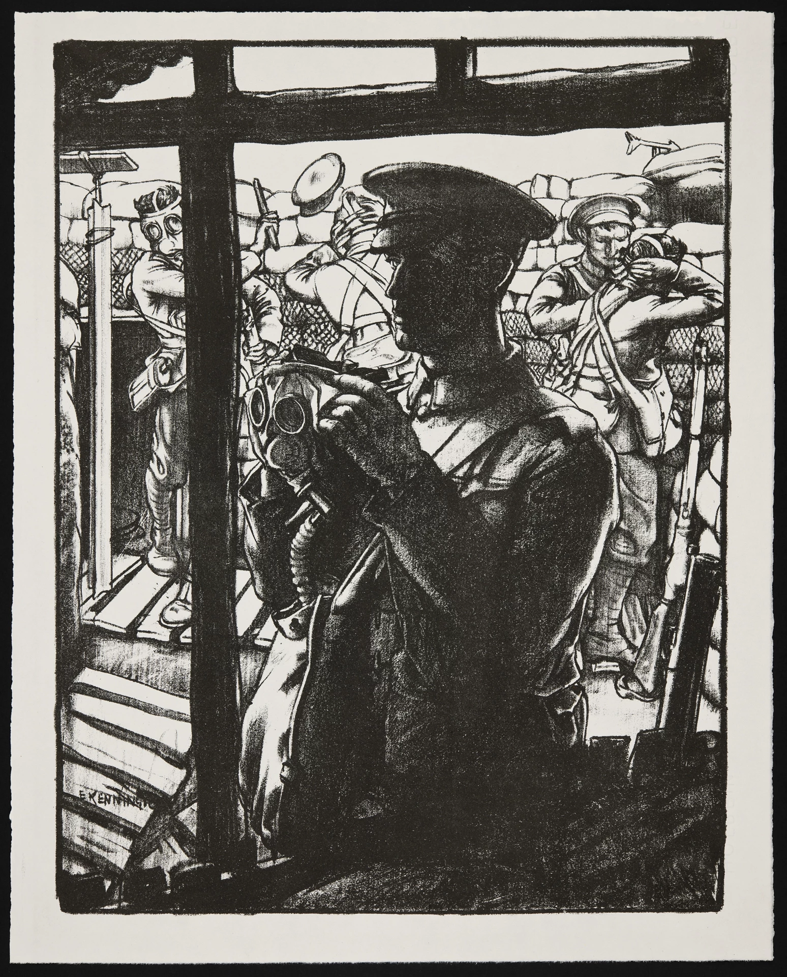 In each of Kennington's images, a soldier dominates the foreground, contextualised by the scene behind him. The soldier is practising putting on his gas mask. More soldiers are helped with theirs behind him. The masks were to protect the soldiers from chemical attacks, such as mustard gas, which was used for the first time in the First World War. Although set in a trench, the image does not capture the harsh, dirty conditions that the soldiers encountered there.