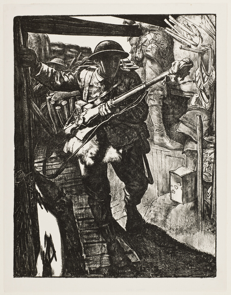 Showing soldiers in training and at the Front, one journalist described these prints as capturing "the spirit of our new, young army". Kennington was probably chosen for this subject as he had himself enlisted with the 13th (Kensington) Battalion London Regiment and fought on the Western Front, France, 1914-1915. He was wounded and discharged as unfit in 1915. These prints do not attempt to depict the horror and tragedy of war, as in most of his war art, Kennington instead champions the common soldier.