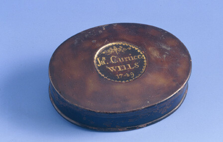 This tobacco box was made at the Allgood family's japanning works at Pontypool. The box is inscribed Jas Curtice / WELLS / 1749 and is one of the earliest known documentary pieces of japanned ware.