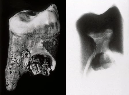 Early Neanderthal tooth (left), and X-ray (right). The X-ray show the enlarged pulp cavity that has helped archaeologists to identify the Pontnewydd teeth as belonging to Neanderthals.