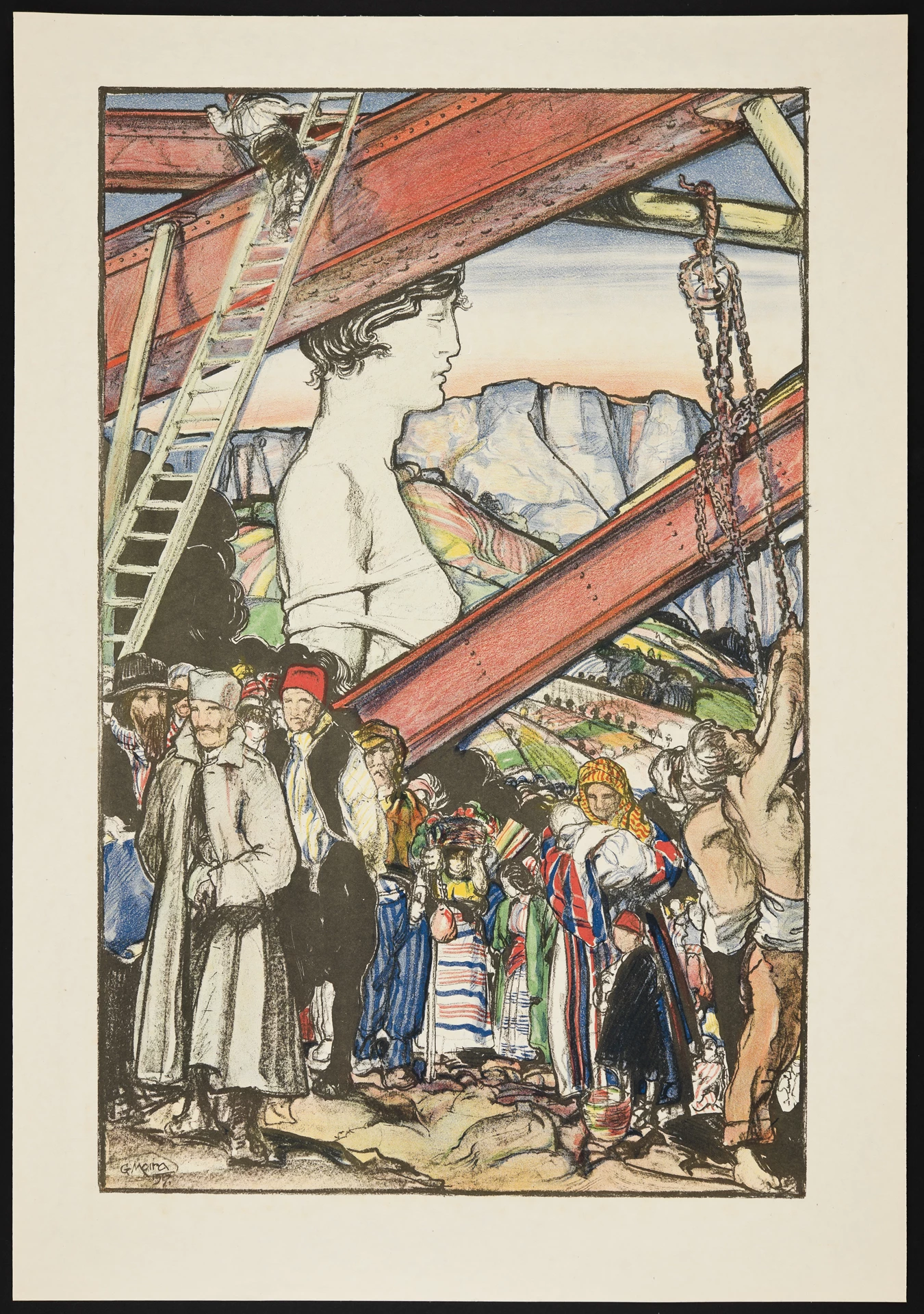 Twelve artists each contributed a large colour lithograph to this section. Some of the artists, including Brangwyn and F. Ernest Jackson, were accomplished lithographers, whilst for others, such as Clausen and Grieffenhagen, it was the first time that they had used the technique.