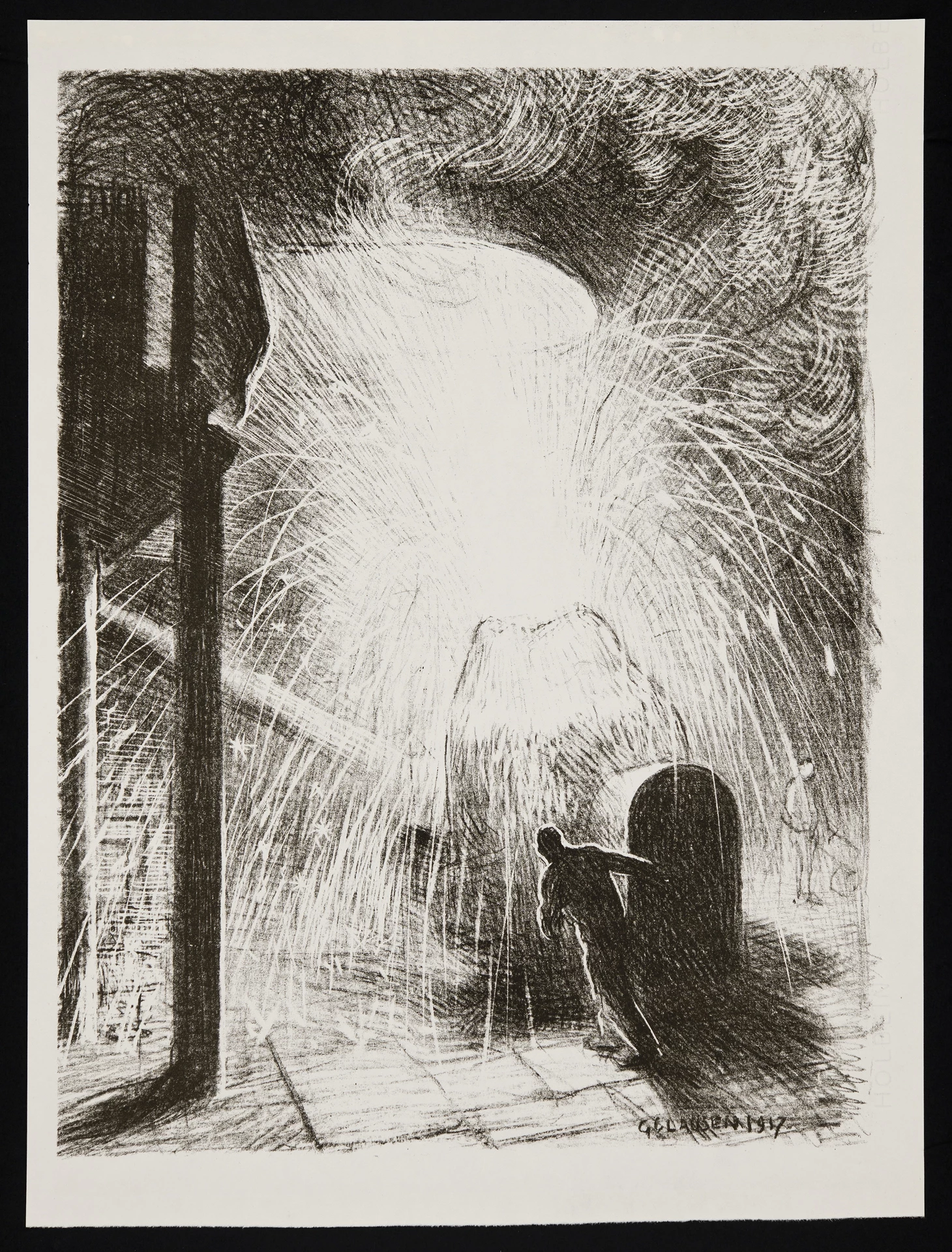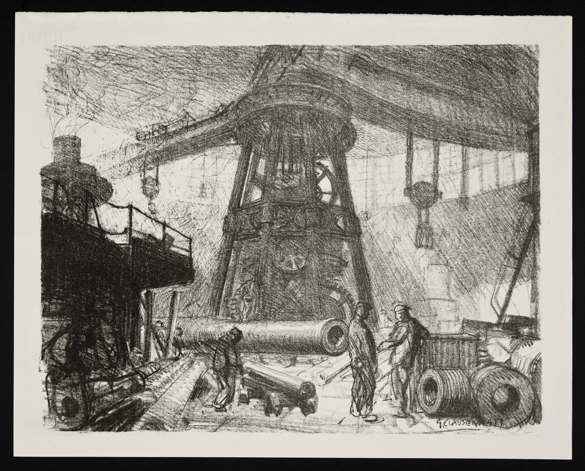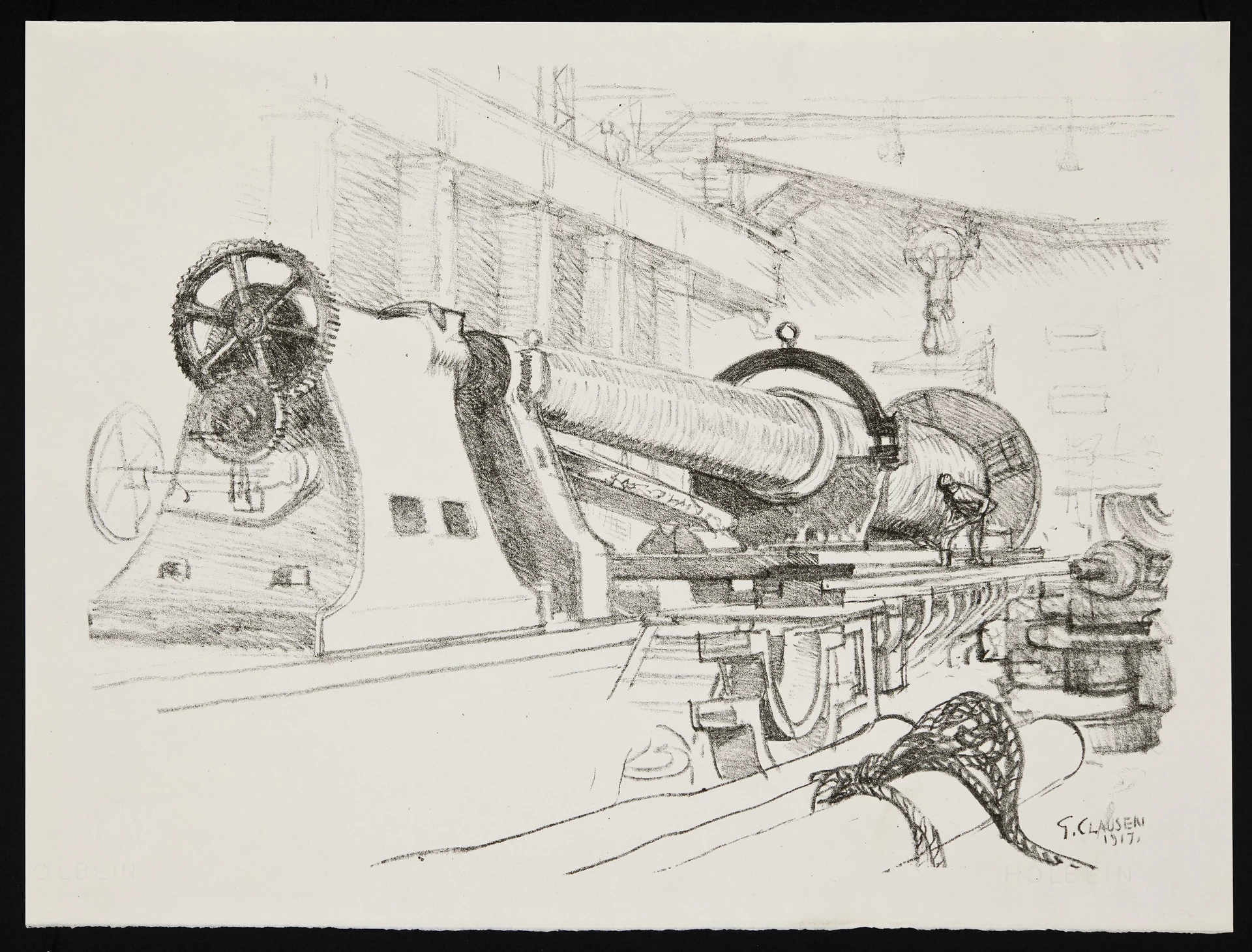 Clausen researched this set of prints at the Royal Gun Factory, Woolwich Arsenal, London, which manufactured armaments, ammunition and explosives for the British Armed Forces. At its peak during the First World War it employed around 80,000 people and extended over 1,30 acres. Clausen was appointed an official war artist in 1917. As an older artist he did not go to the Front line, instead recording activities on the home front.