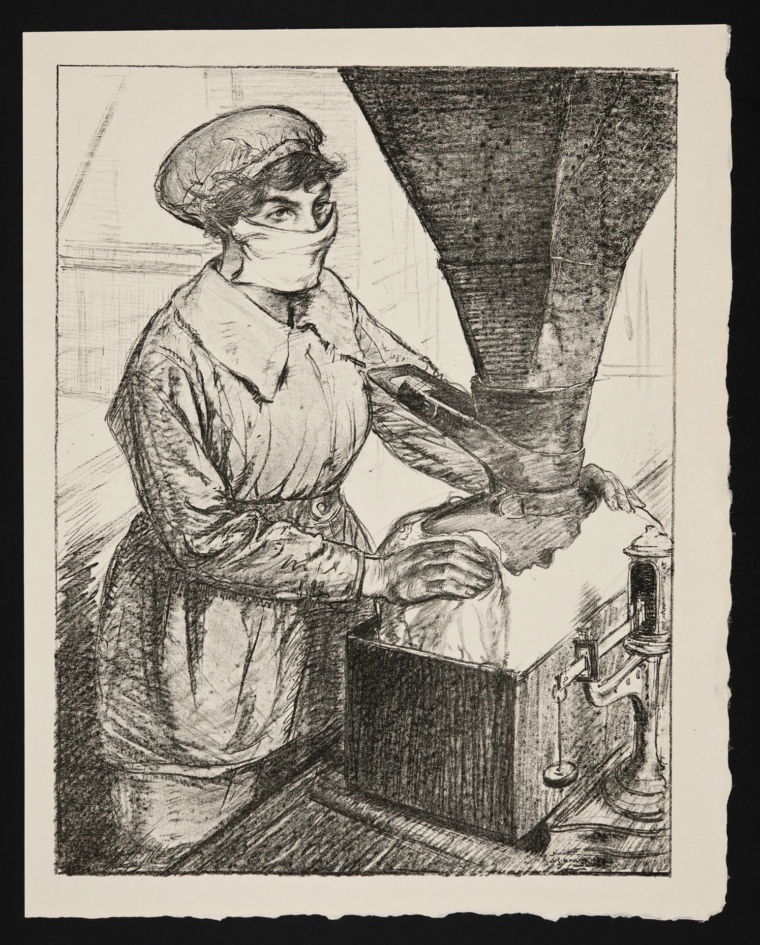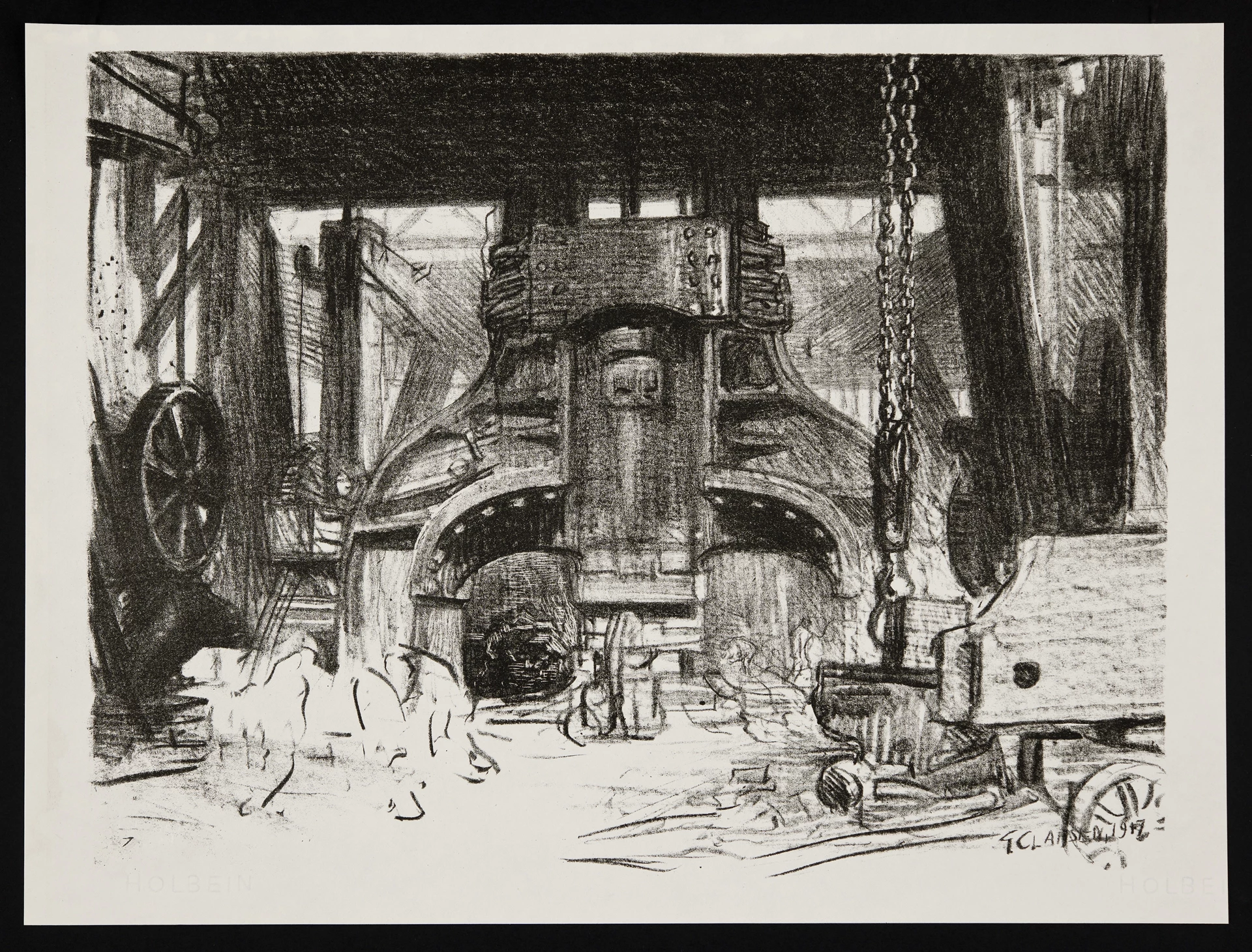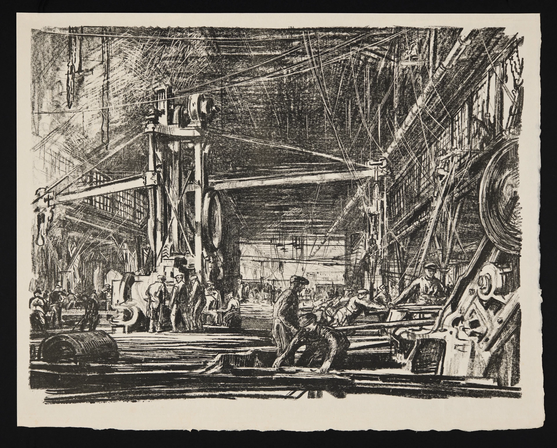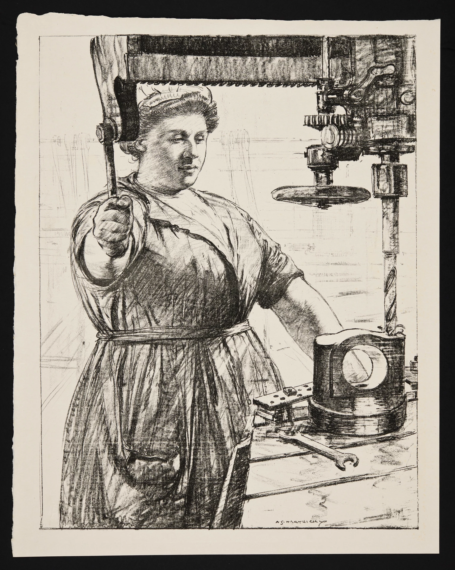Clausen researched this set of prints at the Royal Gun Factory, Woolwich Arsenal, London, which manufactured armaments, ammunition and explosives for the British Armed Forces. At its peak during the First World War it employed around 80,000 people and extended over 1,30 acres. Clausen was appointed an official war artist in 1917. As an older artist he did not go to the Front line, instead recording activities on the home front.