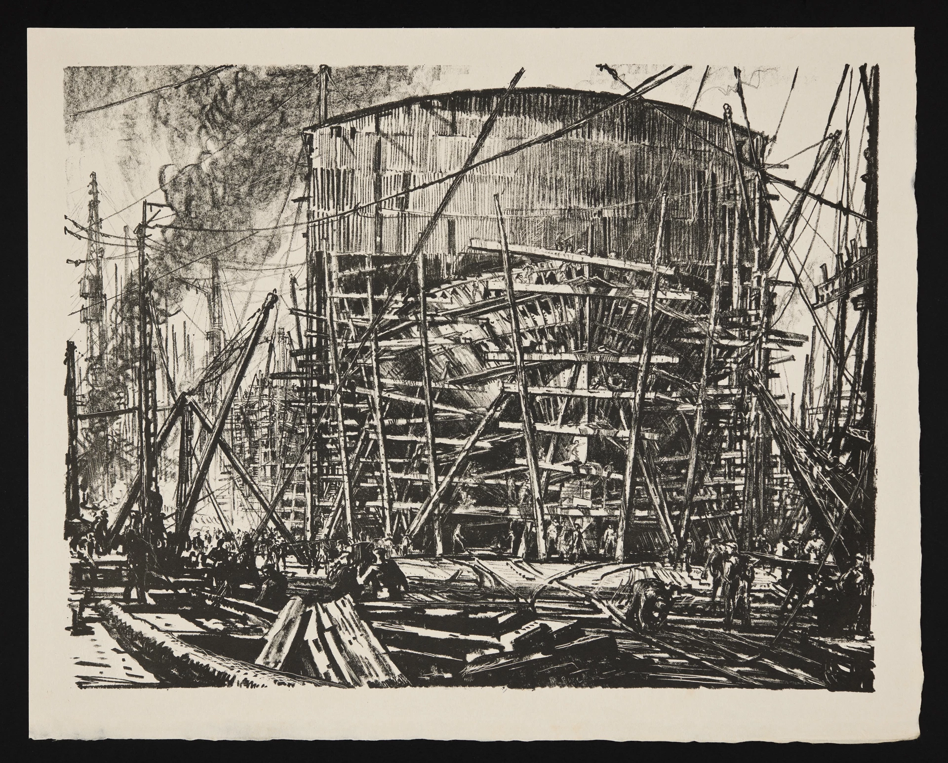 Muirhead Bone was the first appointed official war artist. As one of Britain’s leading draughtsmen, he was renowned for the almost photographic detail he achieved in his drawings. As well as recording the war on the Front, Bone spent time on the Clyde in Scotland, documenting shipbuilding. He sketched with a notebook strapped to his hand. These prints show different stages in the building, as well as views of the yard, one from the top of crane. One journalist wrote that his series, ‘delights in the intricacies of scaffolding and mechanical contrivances’. These images were also published in a War Office publication, The Western Front, vol II, 1917.