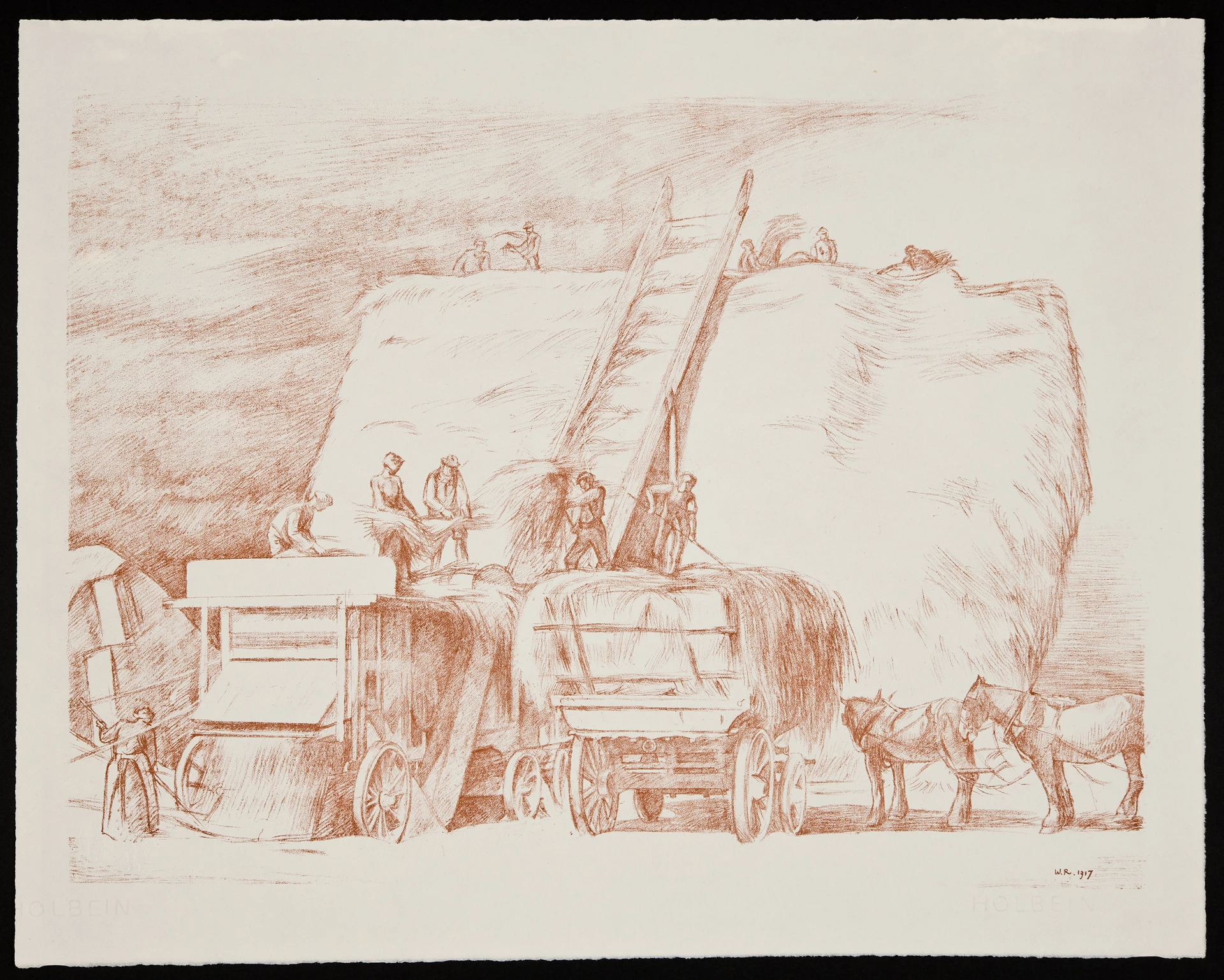 On 15th May 1917, Rothenstein wrote to Ernest Jackson, ‘I hope to have the 5th drawing finished early this week and the last next week. I will then come up to town and do what is needful to the stones’. He was not happy with some of his early work, writing, ‘somehow the lines seem poor and thin’. He decided to print some in a red/brown colour rather than black. These works are simple and understated, a contrast to the busyness and modernity of war shown in many of the other prints in the series. They take their cue from images of rural labour that characterised much landscape painting from the mid-nineteenth century onwards. They were probably drawn around Stroud, Gloucestershire, where Rothenstein was living.