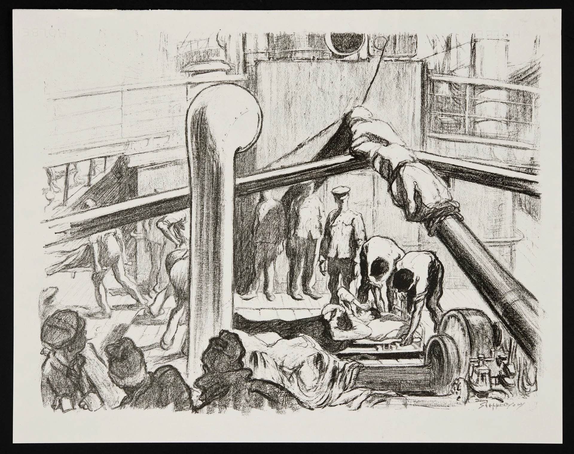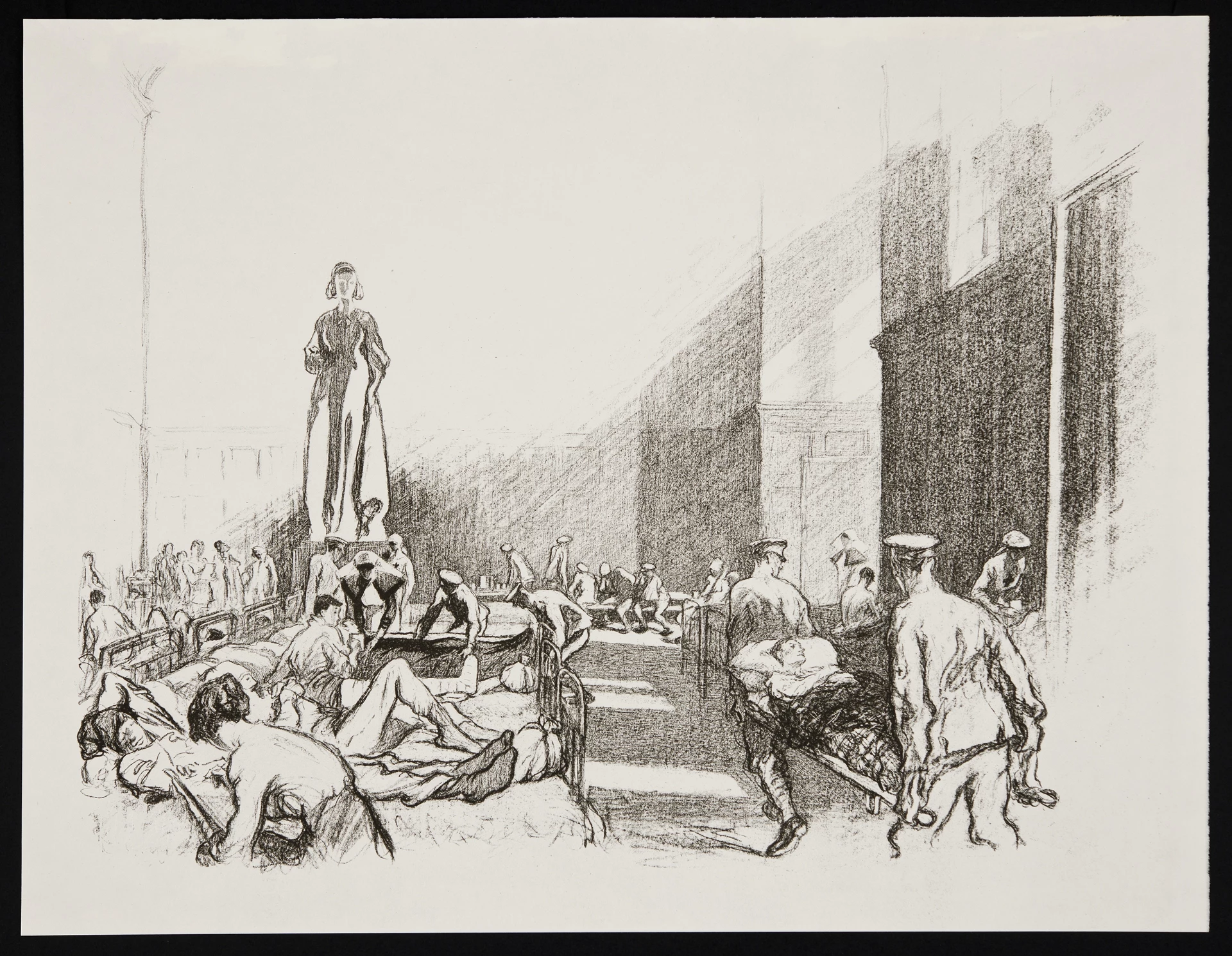 These prints follow the journey of a wounded soldier from the Front Line, through treatment, to convalescence back at home. The organisers initially asked the artist Henry Tonks (1867-1937), a surgeon before becoming an artist, to respond to the work of the medical services. However, Tonks found the paper supplied ‘entirely unsympathetic’for drawing and declined. Shepperson was later commissioned for the subject and produced a very well received series.