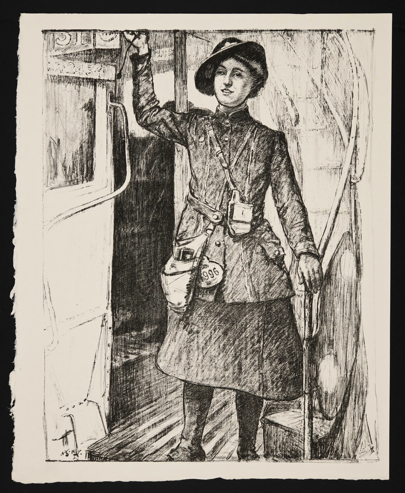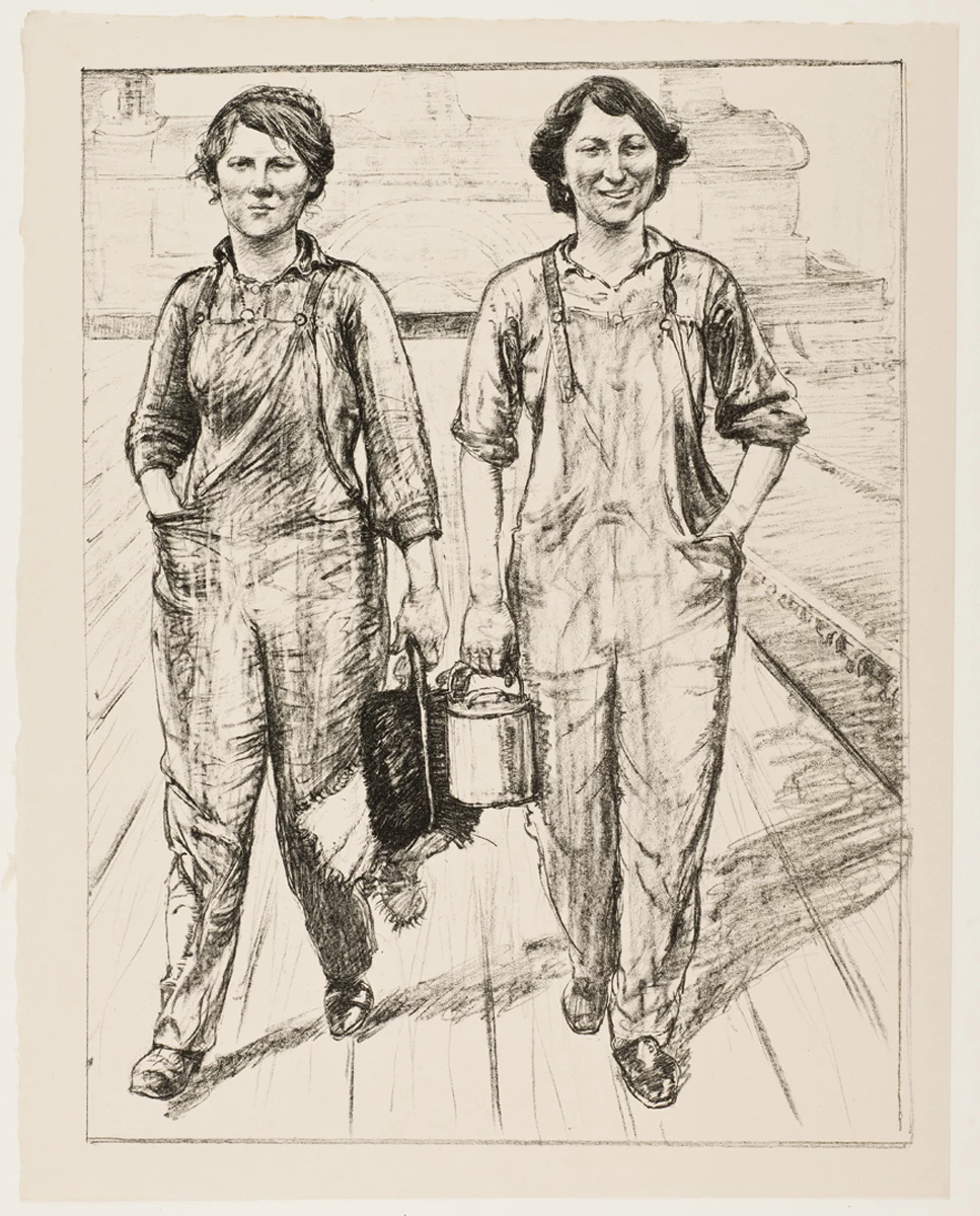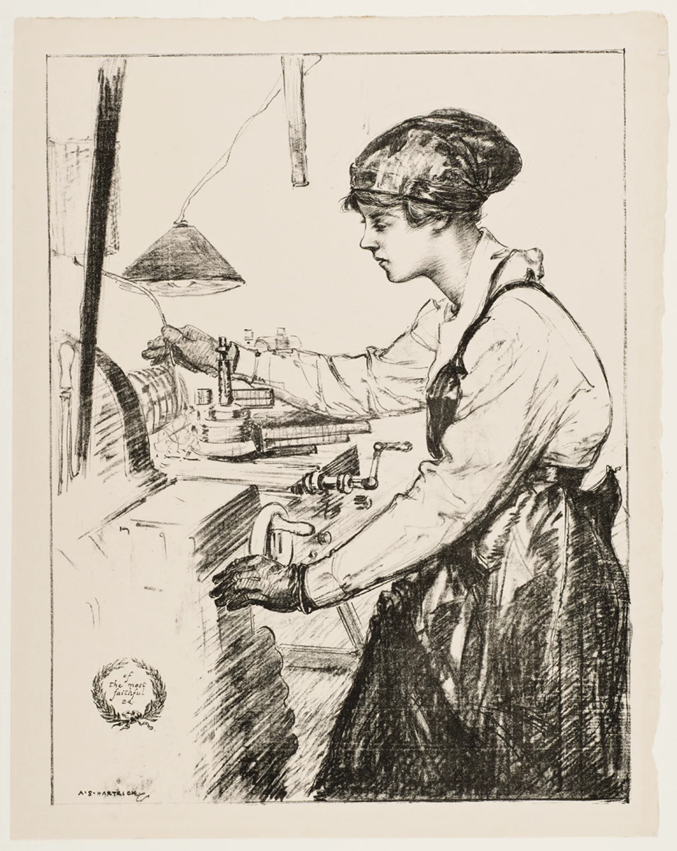 These prints record the vital contribution made by women as part of the war effort. When more men were required for fighting in 1915, there was a call to women to 'do their bit'. In taking on jobs in areas traditionally reserved for men the female workforce raised levels of production both in factories and fields. Although much of the work was both arduous and dangerous, the war allowed many women an unprecedented degree of freedom, and an opportunity to demonstrate their abilities in previously male-dominated spheres. Hartrick was sent to make studies on the spot, and many of the compositions seem deliberately posed - as propaganda images they give no indication of the hardships and hazards that women faced on a daily basis.