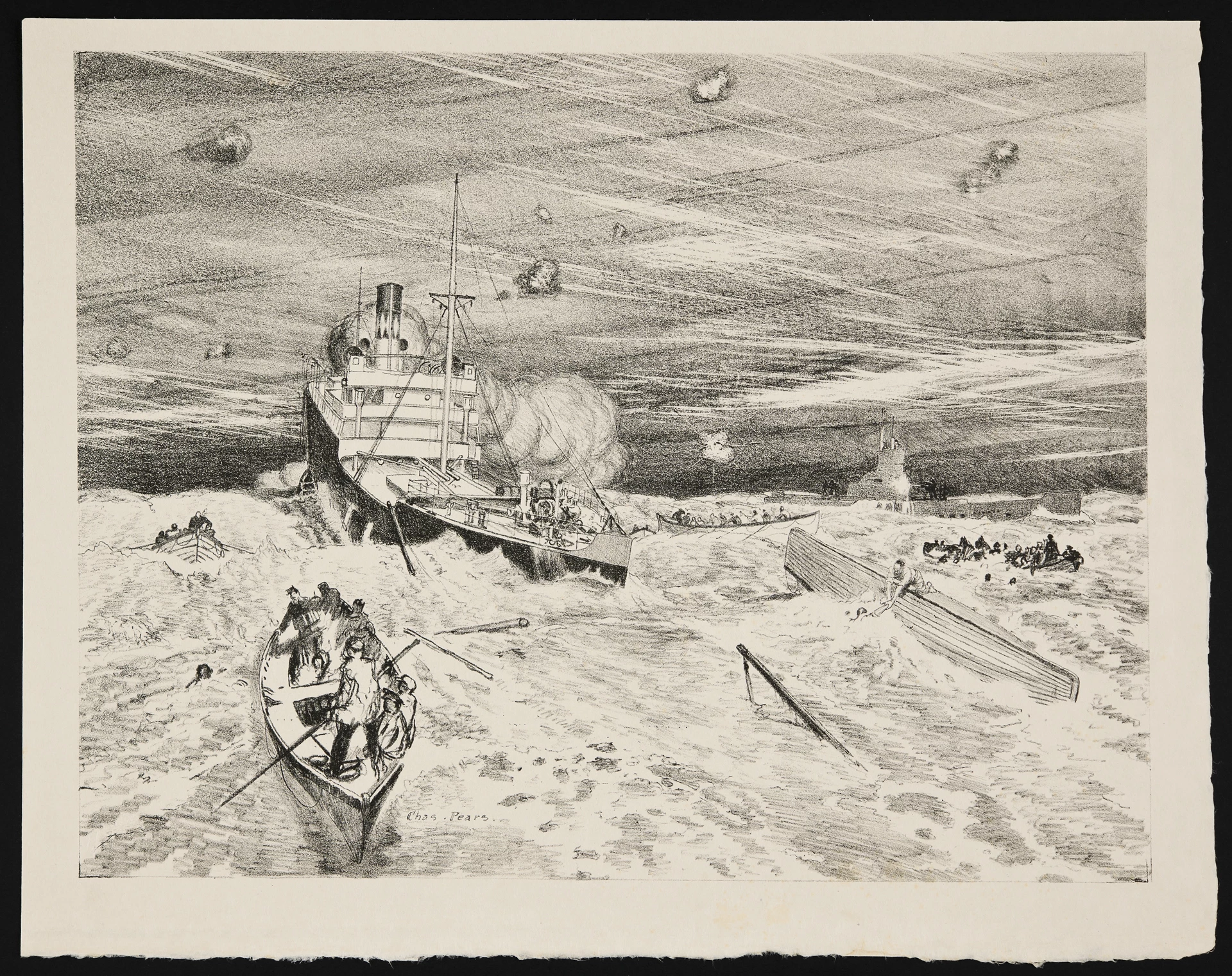 Brangwyn’s subject reflects his interest in the sea. In many of his prints he has exploited the particular quality of lithography that enables artists to create prints similar to sketches and drawings. Brangwyn was deeply affected by the destruction and loss of life in the war, particularly in Belgium, where he had been born. He was never appointed an official war artist, but produced many further lithographs to support various charities.
