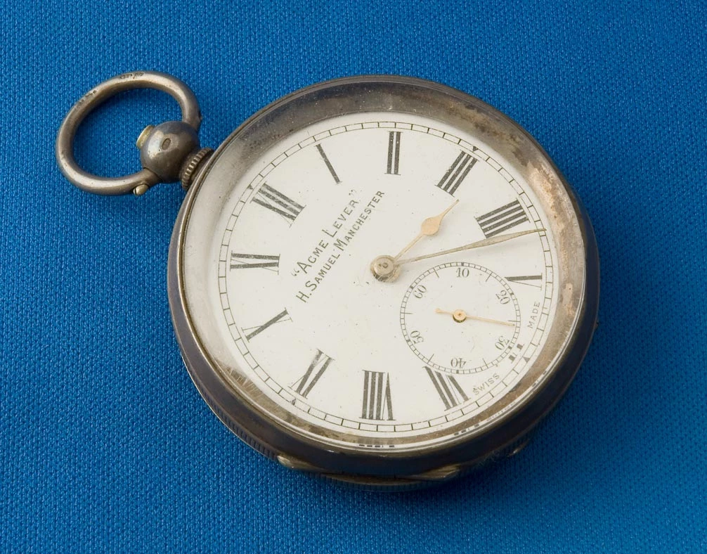 This watch was found on a body following the Senghenydd mine disaster on 14th October 1913 and was used to identify the deceased. The final death toll from the disaster reached 440 men. Some of the bodies were never recovered. It was the worst mining disaster in the history of the British coalfields.
