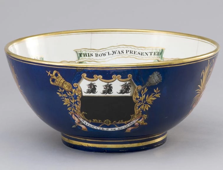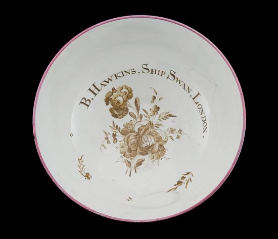 Figure 3: Earthenware punch bowl by the Cambrian Pottery, Swansea, about 1800-1810. It is inscribed 'B, HAWKINS, SHIP SWAN, LONDON', suggesting it was used at a tavern or punch-house.