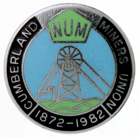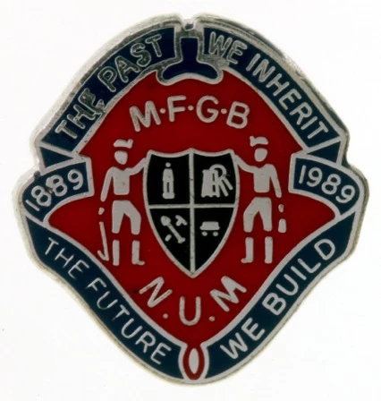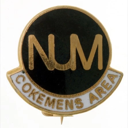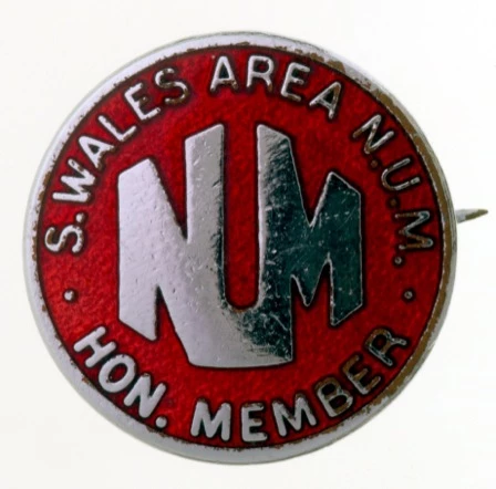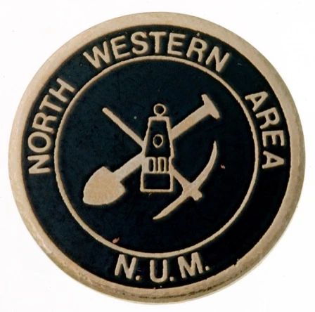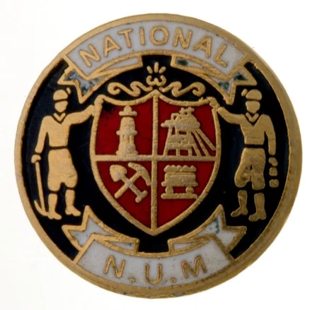 The greatest number of badges were produced during and after the 1984-85 miners' strike. They came in various shapes and colours but usually gave the name of the National Union of Mineworkers (N.U.M.) Lodge or area, as well as a particular symbol. This could be an icon of the mining industry such as a lamp, headgear, crossed pick and shovel; or an example of working class symbolism such as clasped hands, broken chains and the scales of justice. In addition, badges produced in Wales often include a red dragon or a leek.