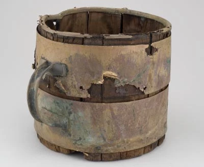 When full, the tankard would have held nearly four pints of beer or cider. It was held in two hands and was probably passed around a group as a communal drinking vessel. This vessel was made of six wood staves, slotted around a circular base-piece. Surrounding the outer face of the body are two bands of bronze sheet. The vessel has a cast copper-alloy handle, attached to the tankard wall by two pairs of rivets.