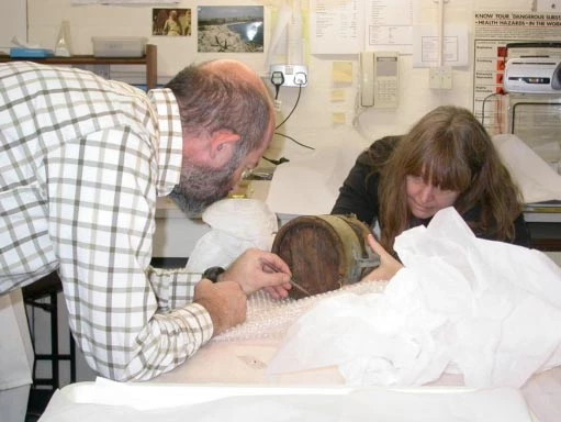 Museum conservator Mary Davis and environmental archaeologist Nigel Nayling (Lampeter University) taking wood samples from the tankard. Microscope analysis has shown that the tankard was made of yew wood, a specially selected and very slow growing tree species.