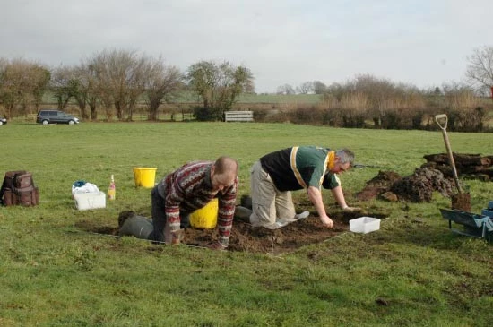 The finder, Craig Mills, and museum archaeologist Mark Lewis (National Roman Legion Museum at Caerleon), investigating the tankard find-spot