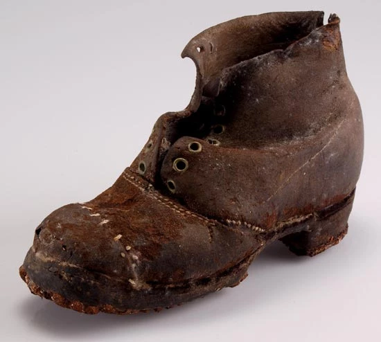 The most frequently found hidden garments are shoes. They are usually discovered near chimneys or fireplaces, but rarely are they found in pairs. Children's shoes are the most commonly found garments. This mid 19th century leather shoe was discovered in 1994 behind a fireplace in a stone built house in Llanfachreth. The owners found four other shoes in the same location, each well-worn and in a degraded condition. They almost certainly belonged to a family unit of two parents and three children.