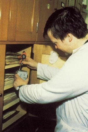 Testing for mercury vapour levels inside the herbarium cupboards.