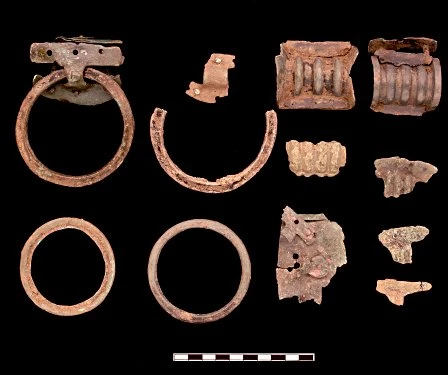 Handles and straps from cauldrons and bowls found at Llanmaes. Cauldrons were large bronze vessels used during feasts.