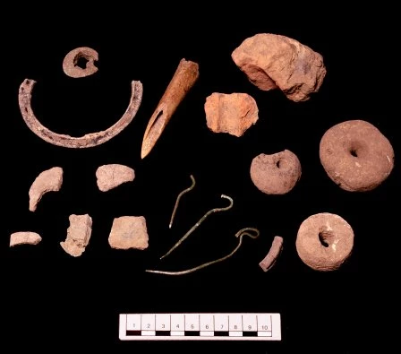 Finds from Llanmaes 2004: axe and cauldron fragments, swan's neck pins, spindle whorls and loom-weights.