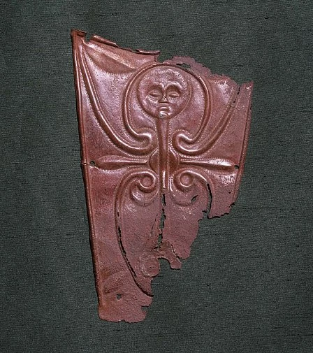 The crescentic plaque from Llyn Cerrig Bach (pictured) is decorated with an elaborate triskele, each limb ending with a trumpet and raised circle that suggests a stylised bird head.