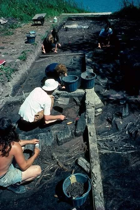 Excavations at Llan-gors Lake in 1991. The textile was discovered in the silts beyond the oak palisade visible in this trench.