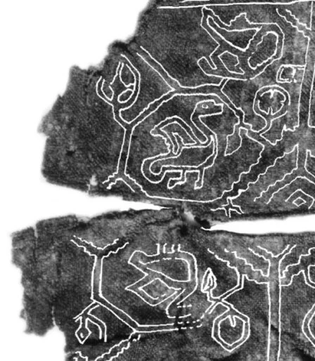 Part of the decoration preserved on the textile, showing a group of birds framed by vines. Unfortunately none of the original colour was preserved in the textile, making the design very difficult to see without assistance. It is picked out here with superimposed white lines. The total area shown is roughly 9cm tall by 7cm wide (3.5 x 2.8 inches).