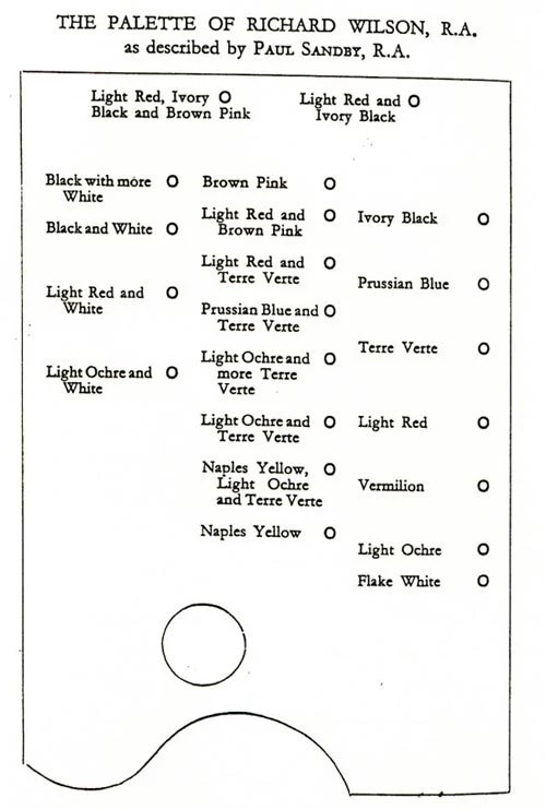 Wilson's palette according to Paul Sandby from Whitley's Artists and their Friends in England 1700-1799. (Medici Society pub. 1928)
