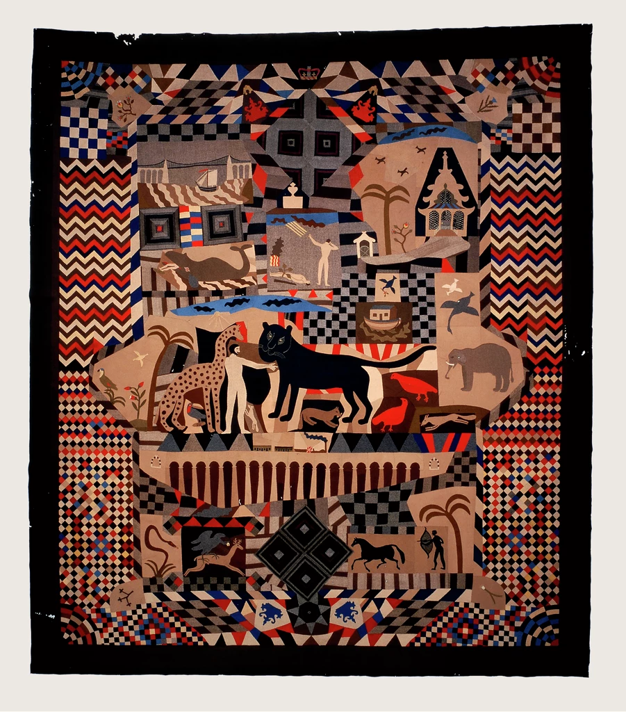 The Wrexham Tailor’s Quilt is probably one of the most well-known patchworks produced in Wales. Made by James Williams – a military master tailor from 8 College Street, Wrexham – its design is unlike any other in the Museum’s collection. The quilt’s background is a pieced composition of diamond patches, chevrons, squares and rhomboids. Biblical scenes dominate the centre – Adam naming the animals, Jonah and the Whale, Noah’s Ark with a dove bearing an olive branch, and Cain and Abel. Other figurative motifs include Thomas Telford’s Menai Suspension Bridge (opened in 1826), a Chinese pagoda, and Cefn Viaduct, complete with a crossing steam train. Details are picked out through embroidery in silk thread.