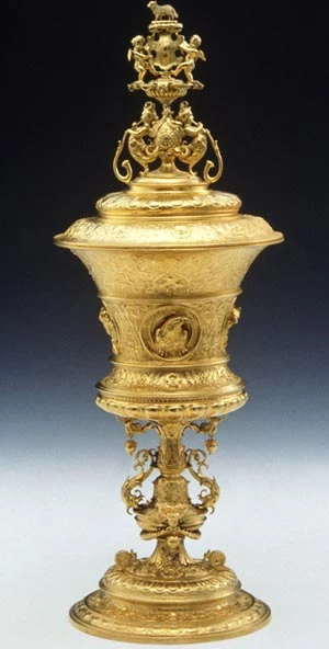 The solid gold cup made from a design on a drawing in the British Museum of a cup given by King Henry VIII to Queen Jane Seymour in 1536. Cup and cover, 22 carat gold, R & S Garrard & Co, London 1867-68. Height: 39.8 cm (15 ''/16 in).