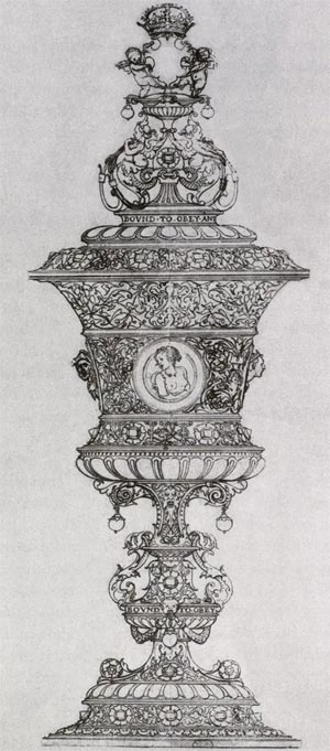 The original design for the cup given to Queen Jayne Seymour in 1536-37 in the British Museum. Hans Holbein the Younger, pen and ink on paper. Copyright British Museum, London