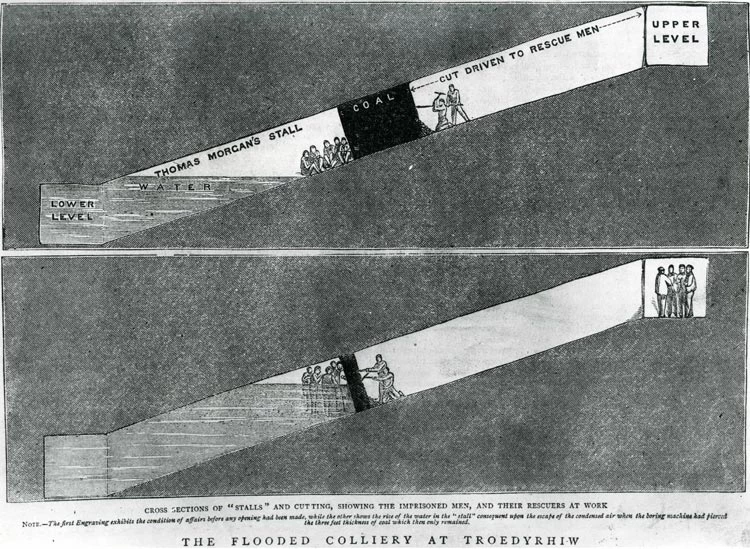 The Chilean rescue reminded many of a similar incident which occurred in the Rhondda Valleys over 130 years before. On the 11th April 1877 Tynewydd Colliery in Porth became flooded by water from the abandoned workings of the nearby Cymmer Old Colliery. At the time of the inundation fourteen miners were underground at Tynewydd and rescue attempts were begun to find them.