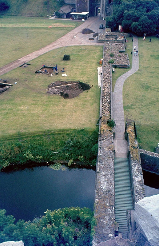 The material for the banks on the north, east and part of the south sides was taken from a massive ditch dug around the entire enclosure. This is now filled in on Kingsway and Castle/Duke Street and underlies the present western moat and northern dock feeder.