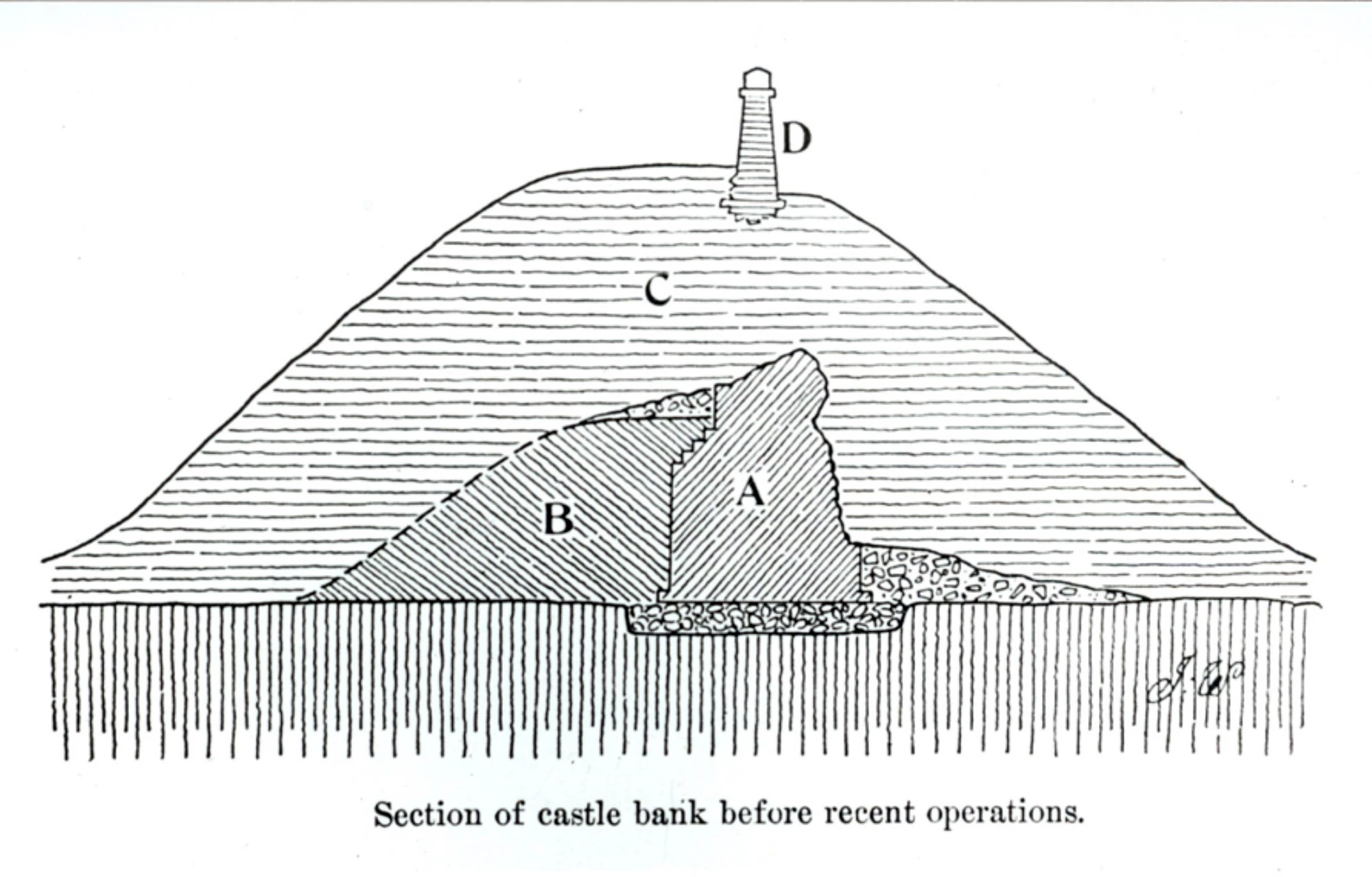 Ward’s schematic diagram of the castle’s earthen bank shows the result of this ditch digging – the sizeable bank still present on the inner side of the castle walls (to the left of the diagram) repeated on the outside.