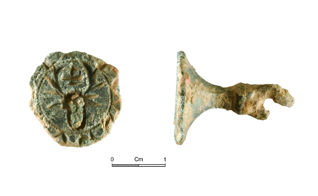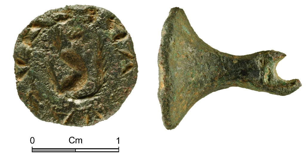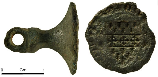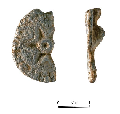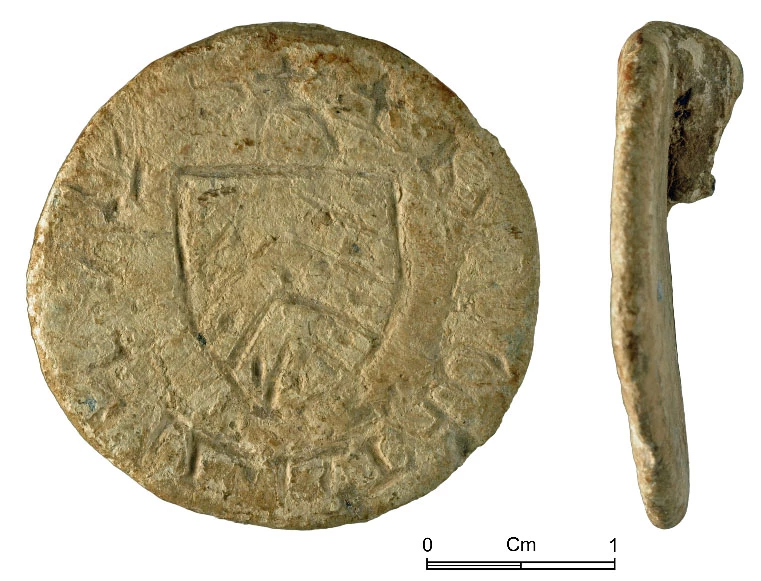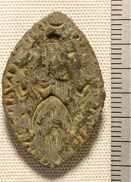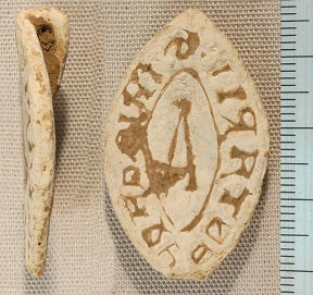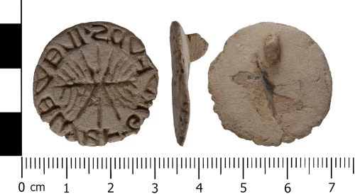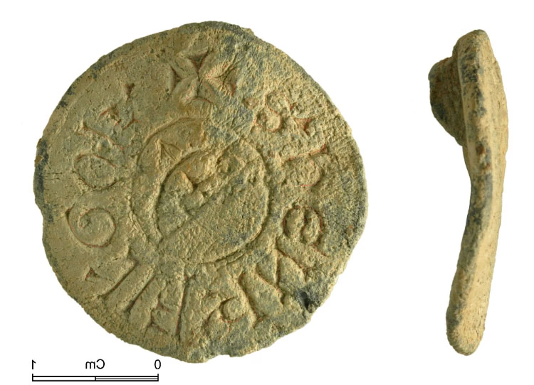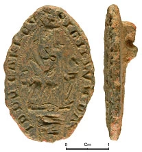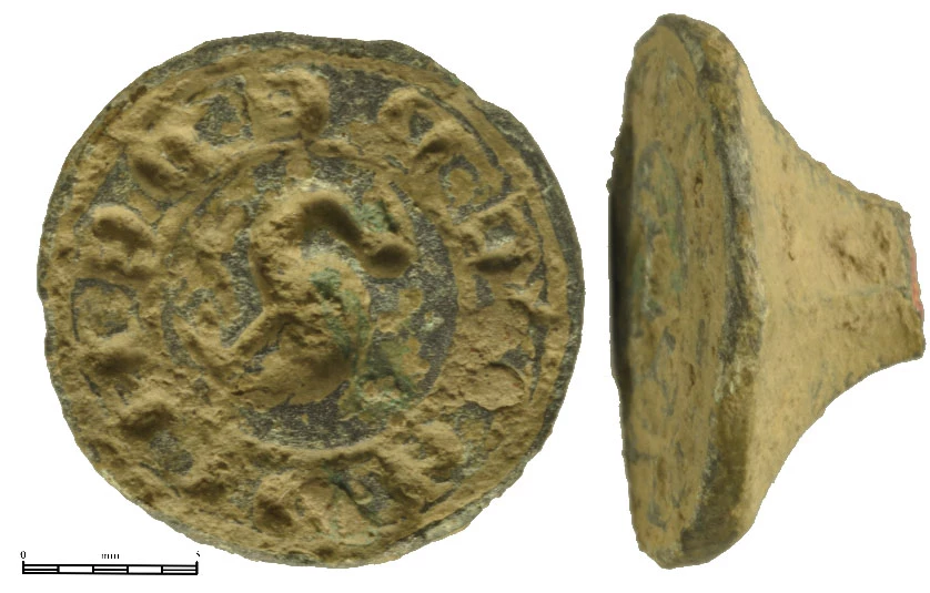 An example of a seal in the form of a flat disc. The 13th century seal of Llewelyn son of Gruffudd, found Abenbury, Wrexham (WREX-D0D606).