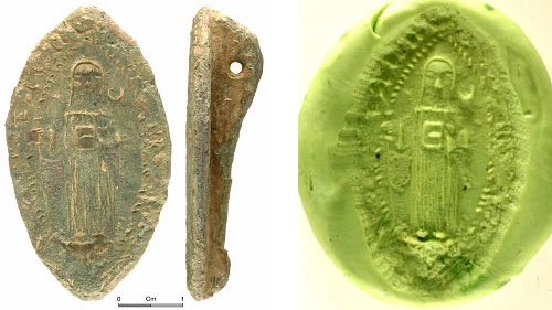 The round seal of Brother Baldwin, mentioned above, contains a Lamb and Flag, the symbol of St John the Baptist. An individual, possibly named Winton or Wilton, had a seal containing an image of another popular medieval saint, Catherine, which was found at St Donat’s, Vale of Glamorgan, in 2012. St Catherine is easily identified by the inclusion of the wheel on which she was martyred.