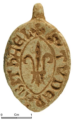 The occasional appearance of bows and arrows, such as on a seal found near Kenfig, Bridgend, in 2012, may indicate an association with archery, either through military service or through hunting. Allusions to occupations are rare however. The only clear reference in a Welsh context recorded with PAS comes from a late thirteenth century lead seal found in Llawhaden, Pembrokeshire, in 2006. This vesica-shaped seal belonged to ‘I’his Carpentarii’ (John the Carpenter), and shows one of the tools of his trade in the shape of a pair of dividers.