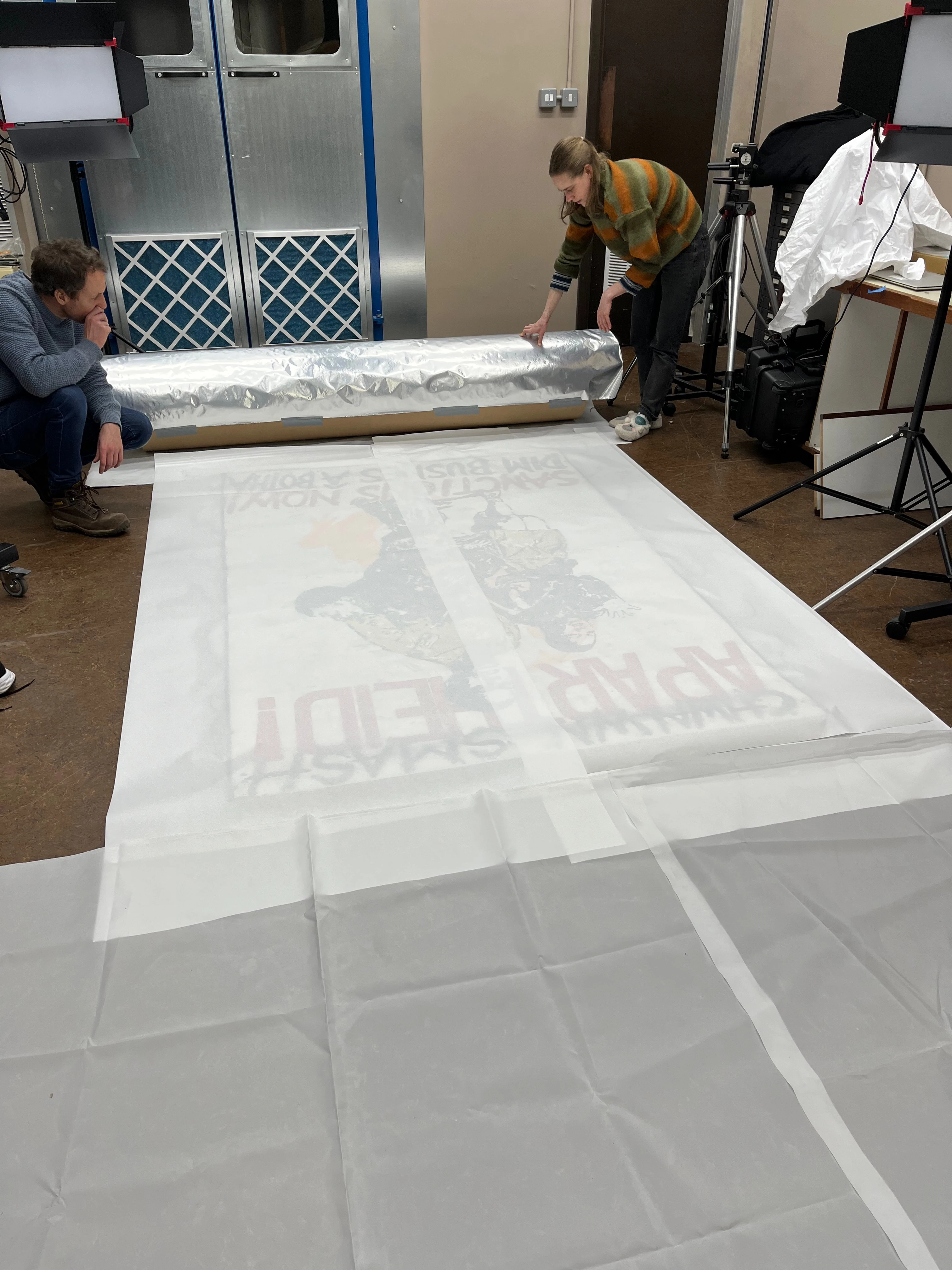 As a paintings conservator, I’m used to working on artworks that were made to be hung on a wall with a purpose to invite admiration and interpretation. For this banner, I was very aware that I wanted to treat it differently, even if the materials and artist’s technique was similar to a modern painting. The banner’s condition was a direct result of how and why it had been made, and how it had been used by protesters. While we needed to find a way of stabilising the banner so it could safely be displayed and stored, many of the go-to conservation methods for stabilising such a damaged painting would change the appearance and structure of the banner, which we wanted to avoid.
