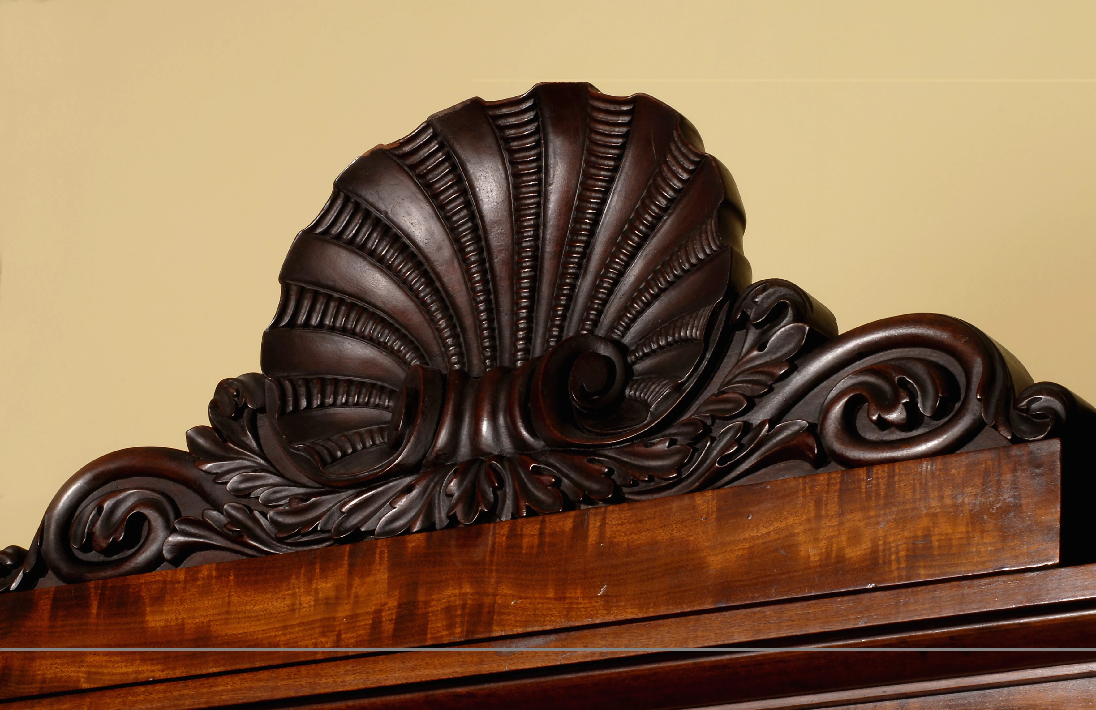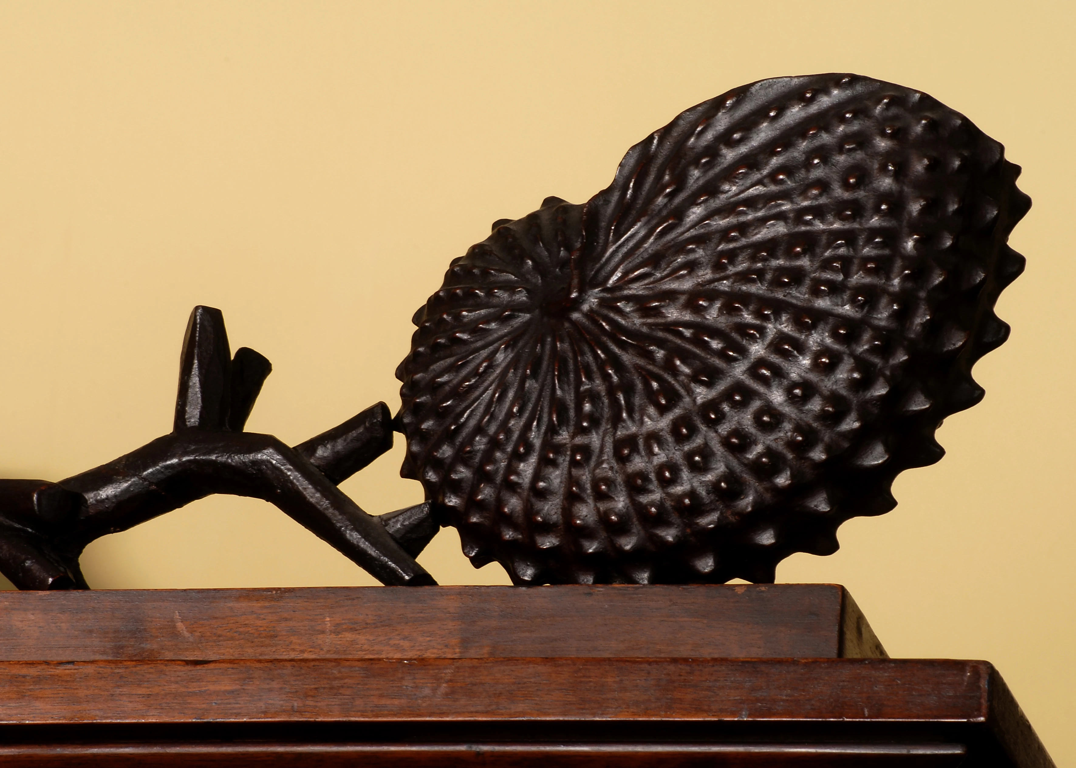 On the cabinet top is an ornate wood carving, heavily pigmented to form a dramatic silhouette. A scallop shell forms a fan at the centre and the shell of a female paper nautilus sits at either end, giving just a hint to what might once have been inside.