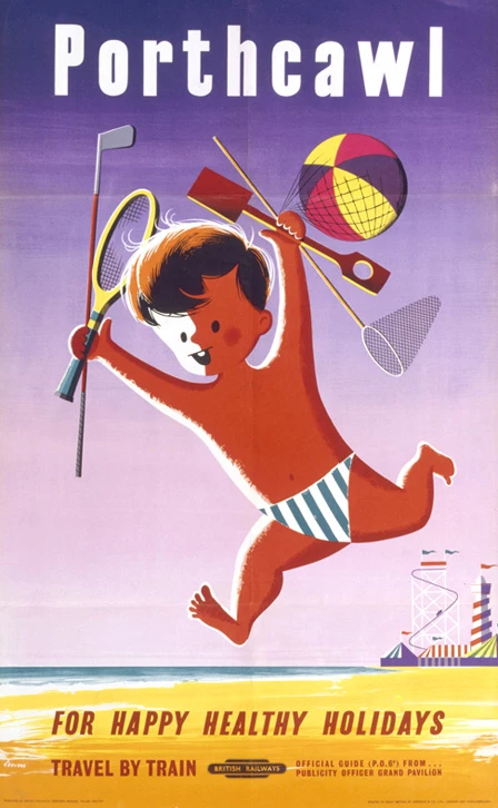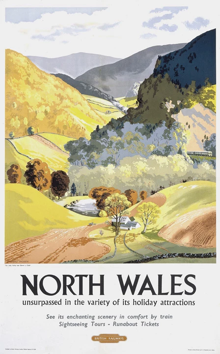Although railway posters have been in popular use since the late nineteenth century, it is generally regarded that their heyday was between 1923 (when four large companies, the Great Western Railway, Southern Railway, London, Midland & Scottish, and London & North Eastern Railway were formed) and 1947, when the railways were nationalised. However, Amgueddfa Cymru has many examples of British Railway posters produced in the 1950s and 60s which are equally eye catching and interesting, and often much more bright and cheerful.