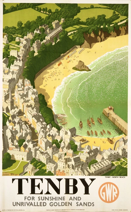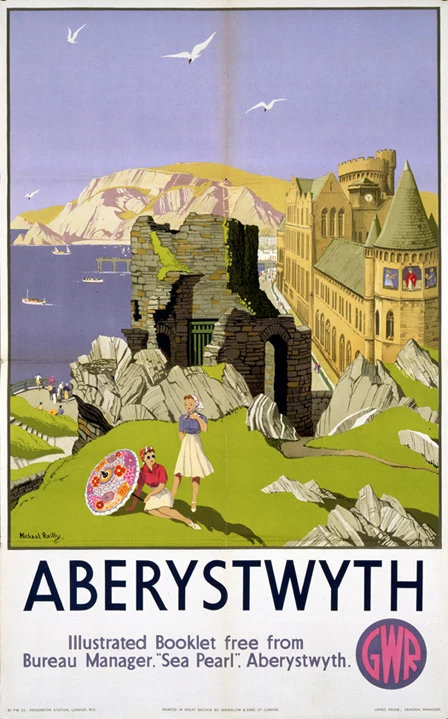 Railway posters were a familiar feature when travelling on the railway, being displayed in stations, ticket offices and on platforms hoardings. They were used to entice the public to board the railway and escape from their daily routine. Generally they presented idealised images of popular holiday resorts, such as Tenby and Aberystwyth; historic towns, such as Caernarfon; and the countryside and coastline of north Wales, Pembrokeshire and Gower. These had all been made accessible by the lines on which the railway companies operated. It is often claimed that the railway invented the ‘package holiday’.