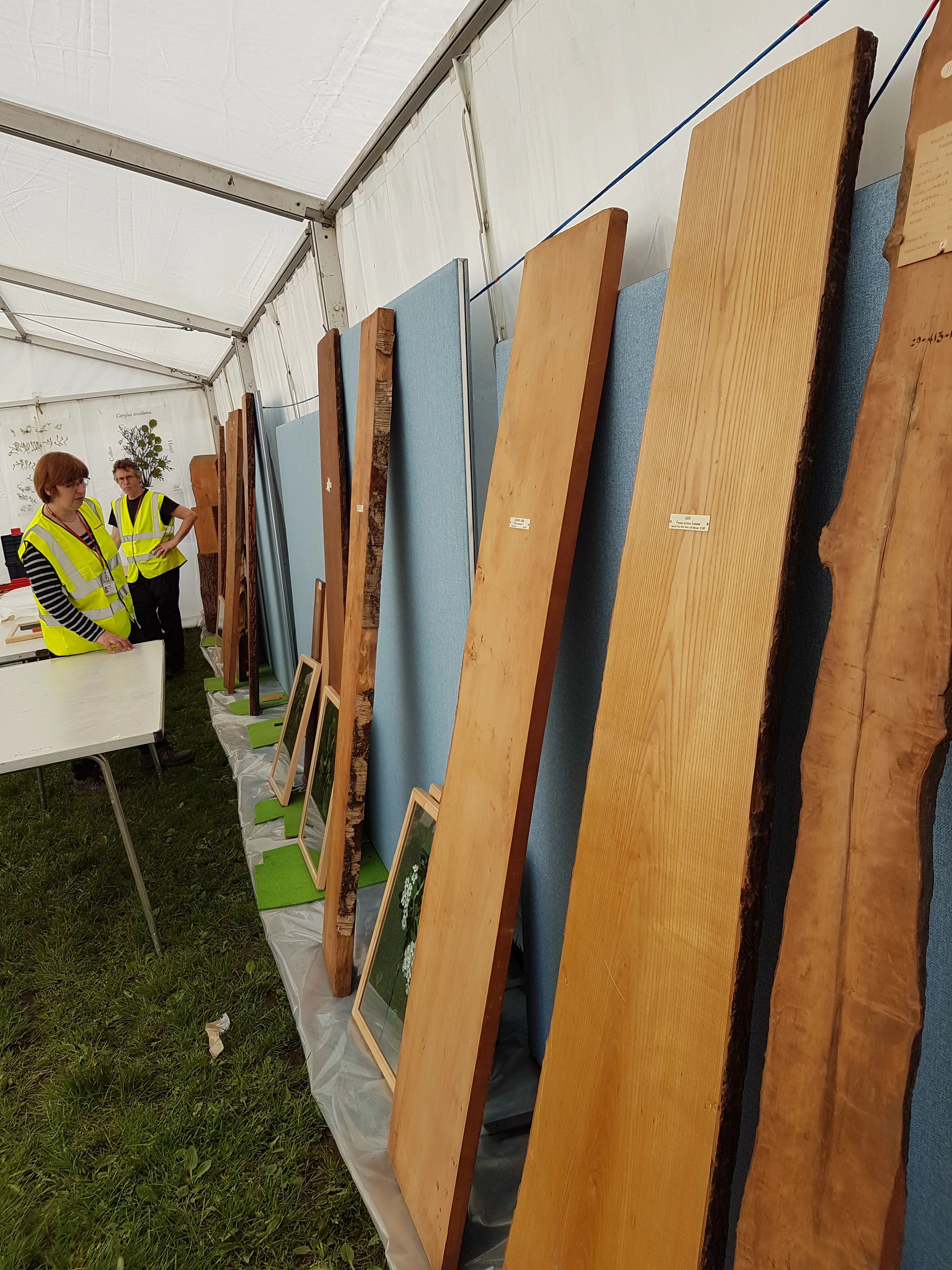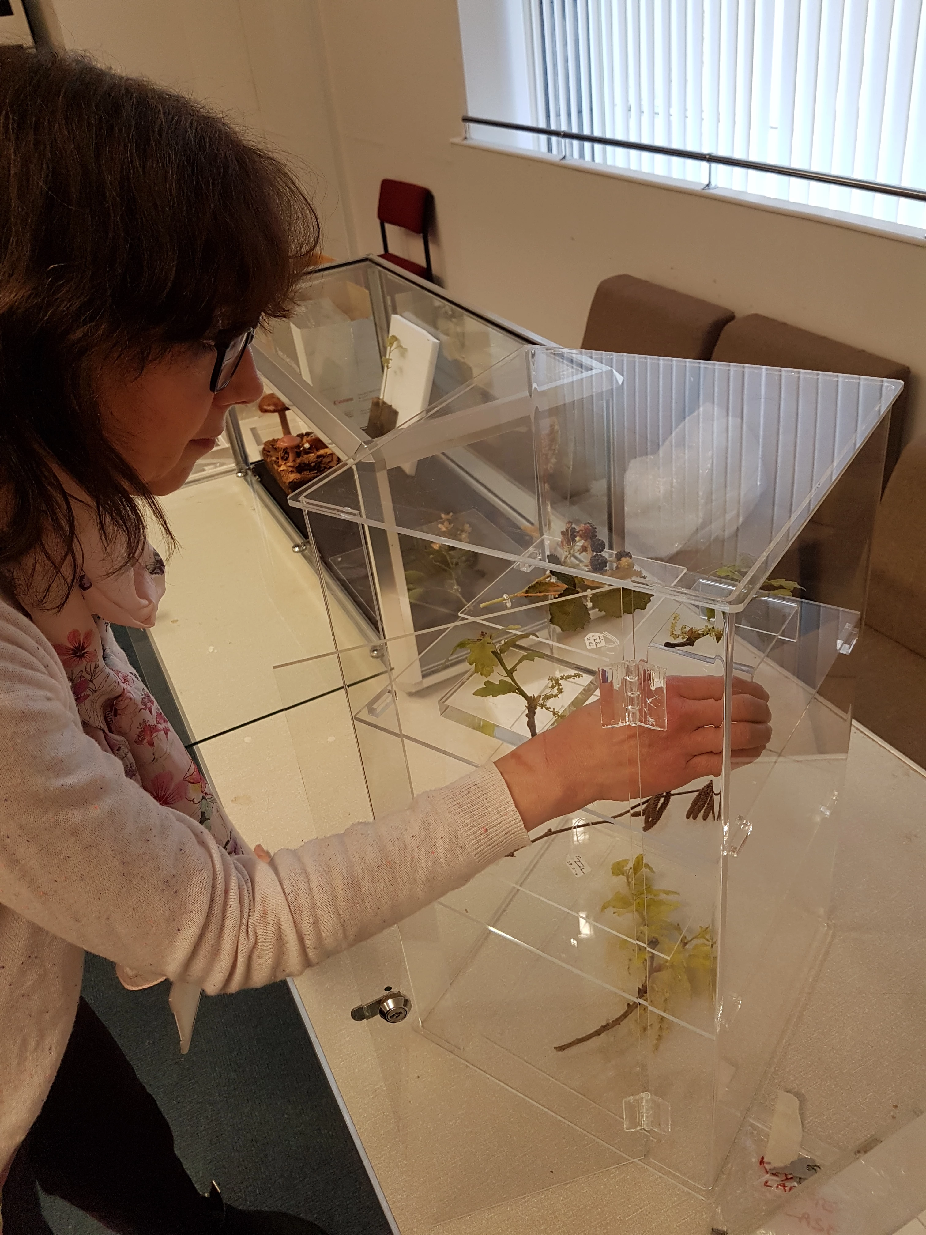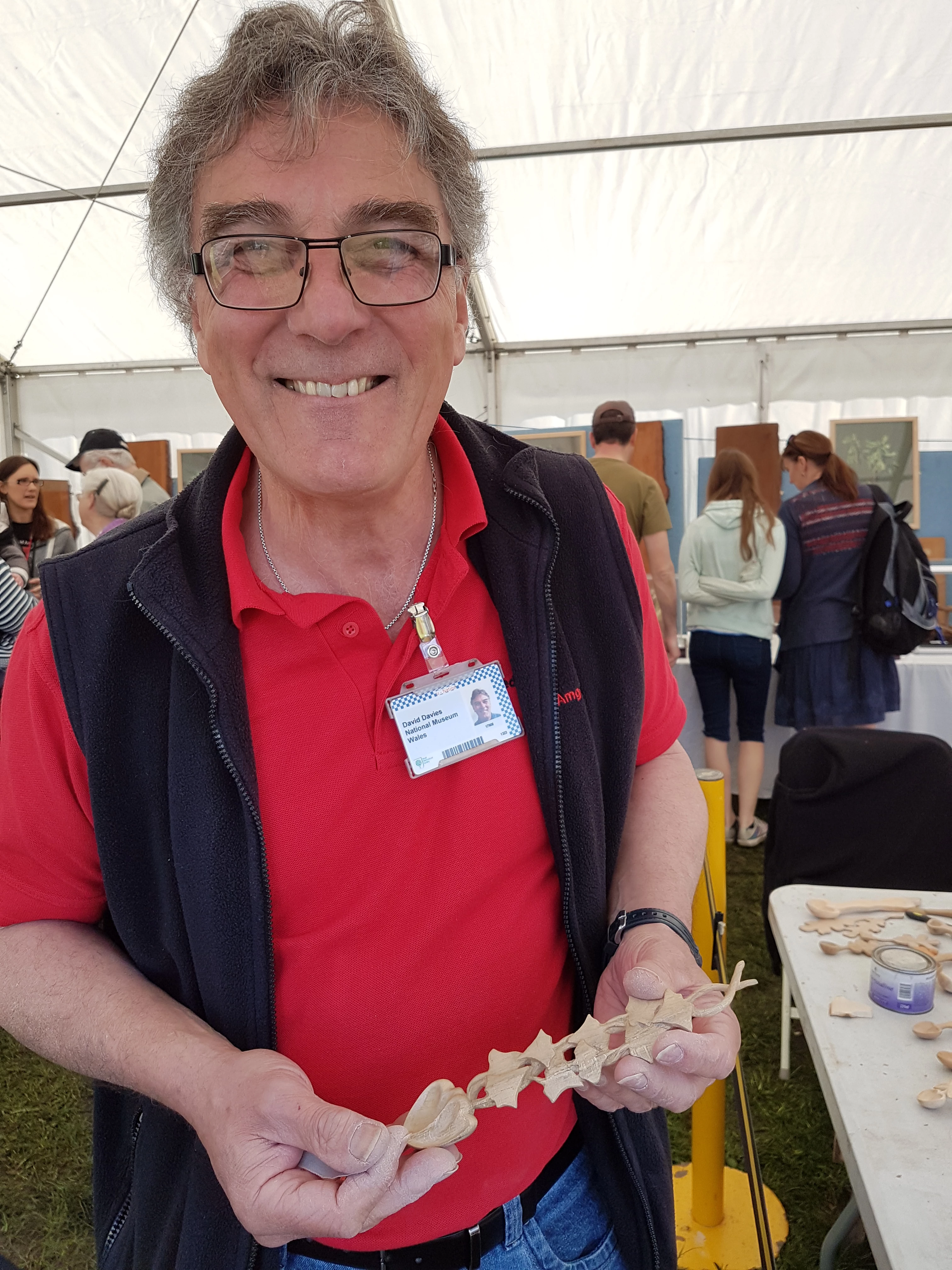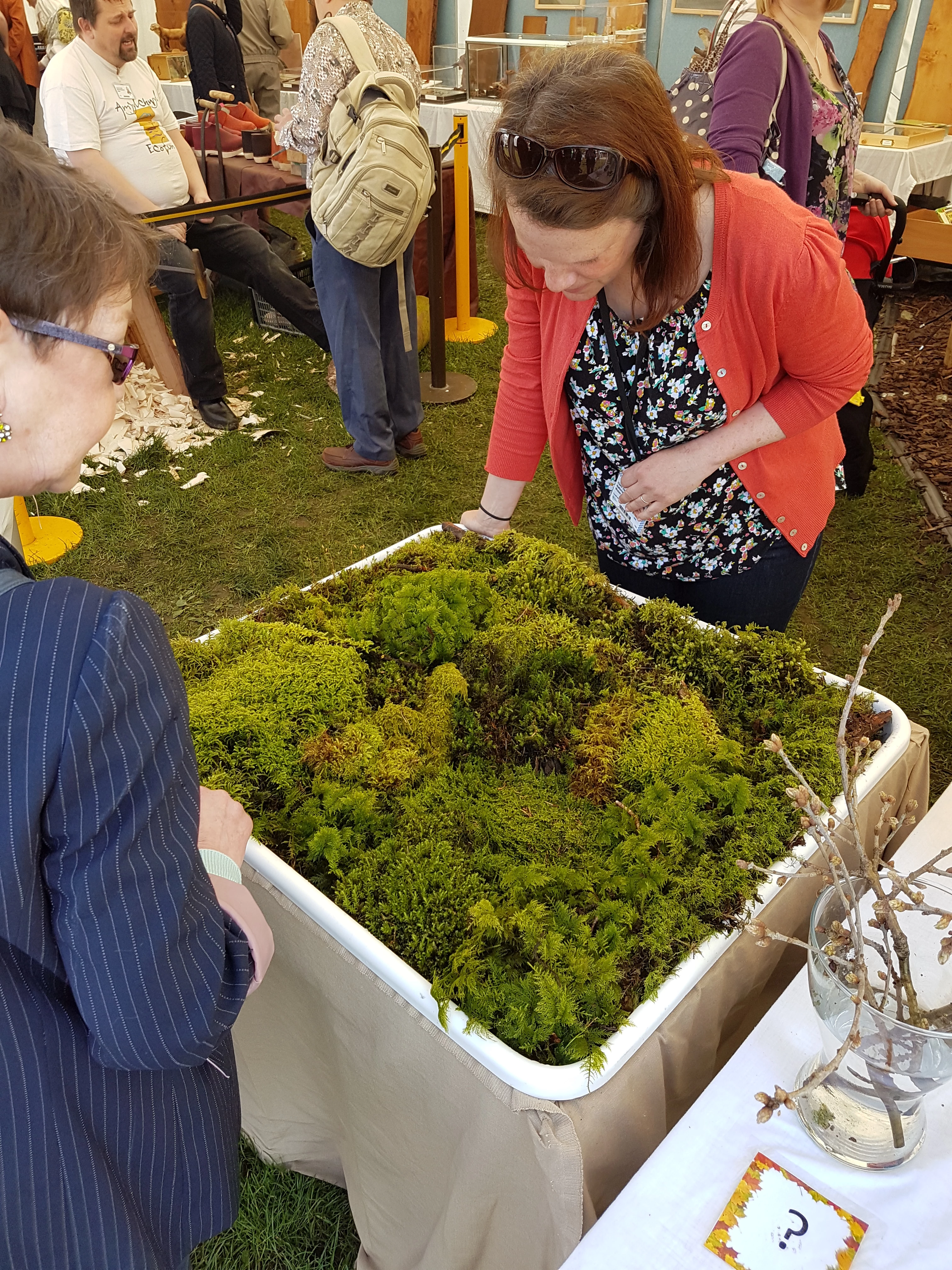 We have had a presence at the Royal Horticultural Society’s Flower Show, Cardiff for over 10 years. This year our theme was Welsh Wood and Woodlands, encouraging visitors to learn all about the plant and animal life associated with Welsh woodlands from the ancient ‘coal forests’ of the Palaeozoic era, through the post-glacial forests, up to the present day. We put our unique Welsh collections on display, including living and preserved plants, botanical wax models, fossils, insects, taxidermy birds and mammals, as well as botanical illustrations. A superb collection of large timbers, rarely on show to the public, formed the centrepiece for the display. In the foreground, a vibrant green moss garden demonstrated the variety of mosses found in Welsh woodlands, while hung as a backdrop were 12 large botanical ‘stained glass’ windows of pressed woodland plants.