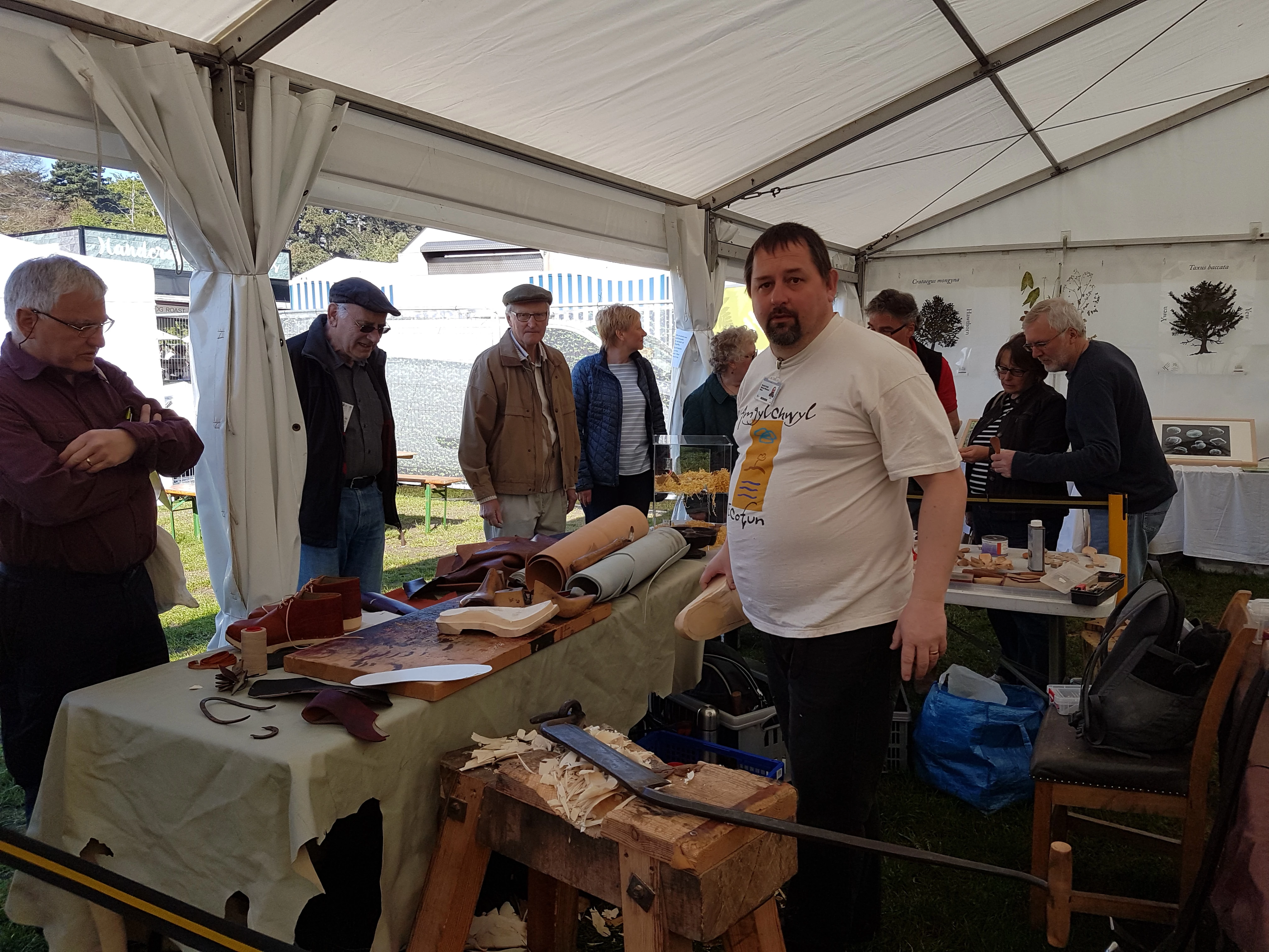 Geraint Parfitt the clog maker and David Davies the woodcarver from St Fagans National History Museum, demonstrated their crafts at the RHS Flower Show for the first time. Members of the public were fascinated to see Geraint practice his traditional craft, turning newly felled timber into clog soles while David showed his skill at making Welsh love spoons.