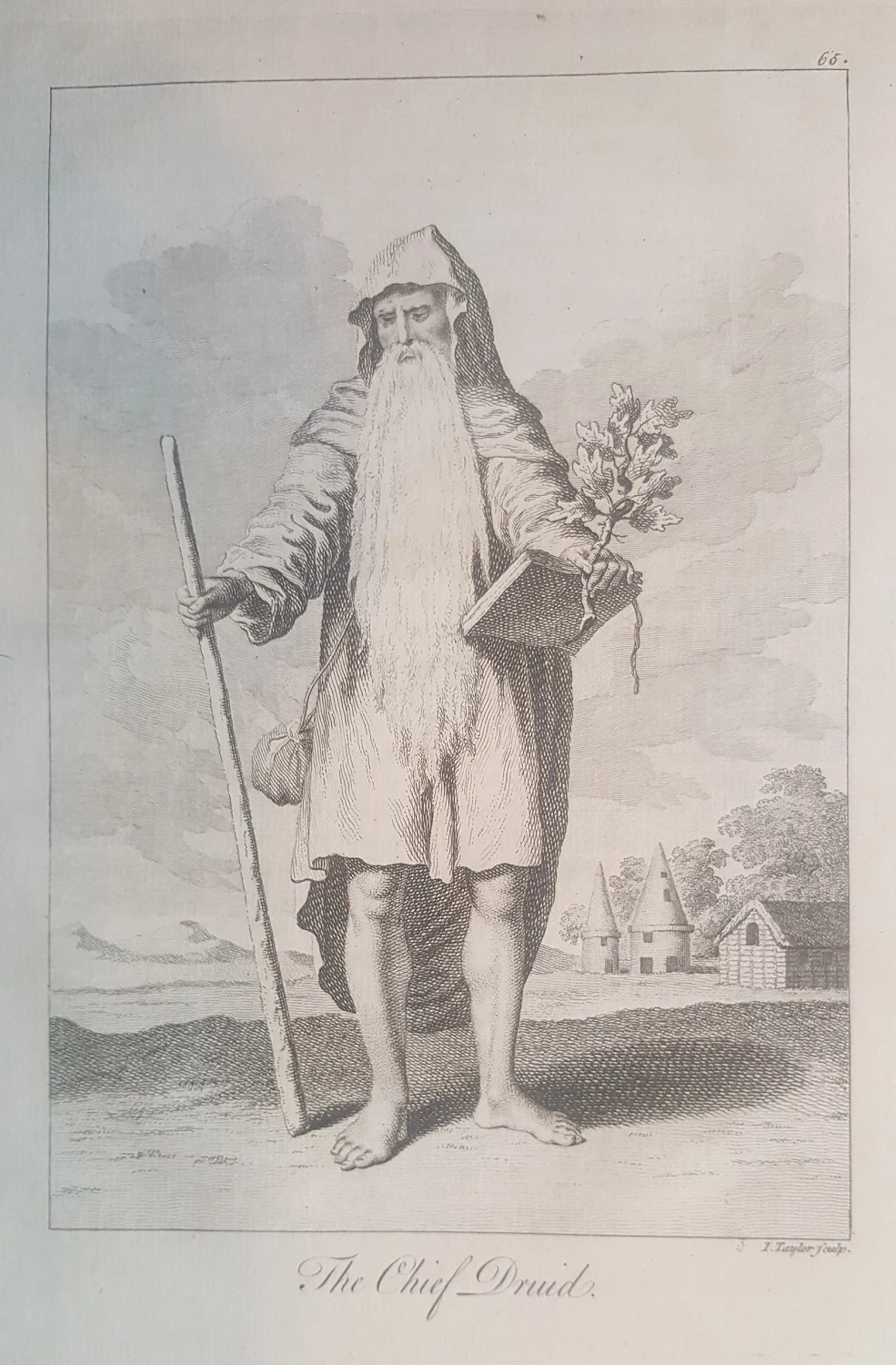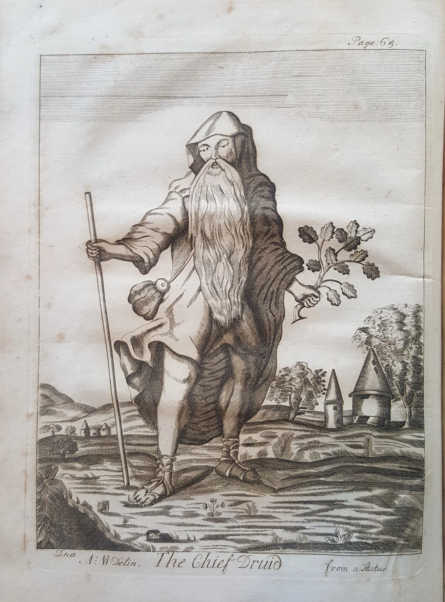 Dr Owen, originally from Dolgellau and a member of the Honourable Society of Cymmrodorion, had a special interest in Welsh antiquities, and made a number of revisions to the book, one of which was the slight changes in appearance of the Druid. He removed the sandals, making the Druid barefoot, and he also added a book to the hand that was holding the oak leaves.