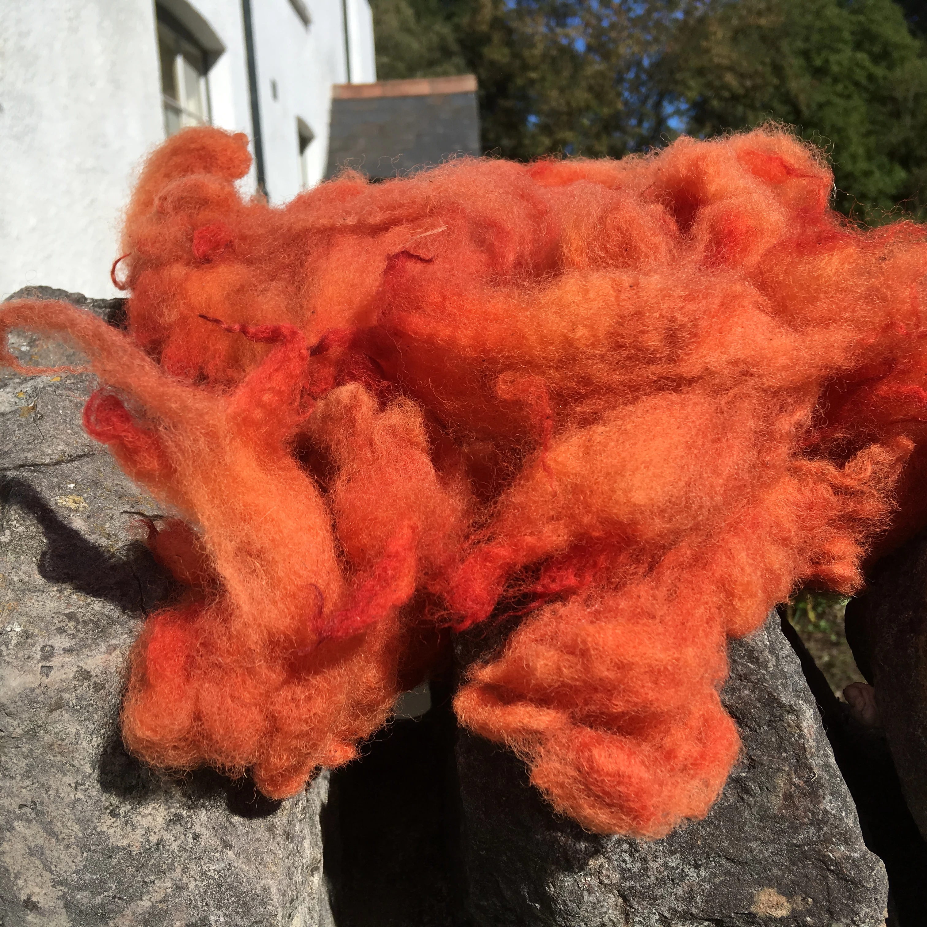 Mordants have been used traditionally to help the dye fix to the wool and create a more intense colour. By the medieval period a naturally occurring mineral called alum was used to pre-treat the wool before dying. We therefore decided to test a few options, so we dyed wool previously mordanted with alum, wool mordanted with Rhubarb leaves and wool not mordanted at all, just to see what impact there would be on the final colour