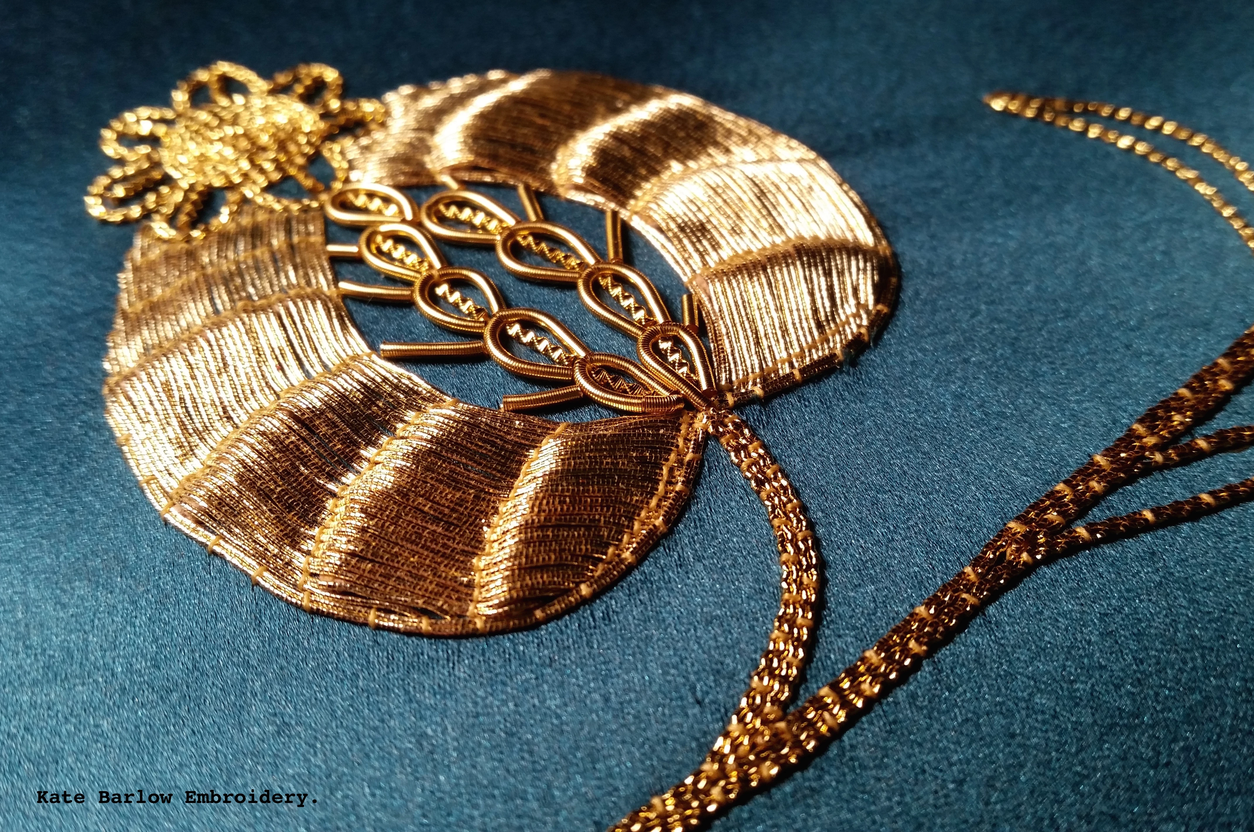 I chose a motif from the original mantua that would make sense on its own and work well as a stand-alone piece. I then chose threads and wires that replicated the originals as closely as possible, and sourced a teal coloured silk satin as the ground fabric.