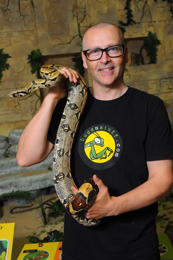 Guy Tansley from Bugs N Stuff with Mela, the Boa constrictor.