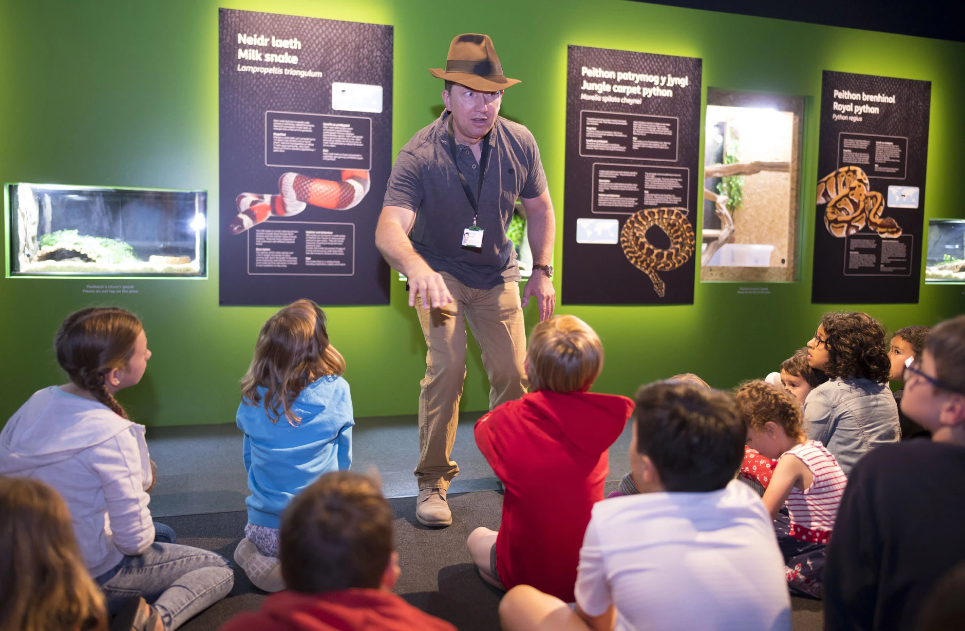 The exhibition features six live snakes and as I’m sure you can imagine, bringing live animals into a museum requires a LOT of preparation. We have done a great deal of work to ensure that their time with us is spent in 5 star accommodation. Their ‘vivaria’ are purpose built to ensure our snakes are well cared for, including warm and cool spots, as well as a water feature for a bathe. We have a fantastic (and very brave) set of staff who are volunteering their time to looking after them including changing water bowls, and clearing up their poo! Dr Rhys Jones (Cardiff University) has been fantastic with helping throughout this whole process, including coming in every week to feed them. The snakes are all provided by a company called Bugs n Stuff, you can see a video of them installing the live snakes here.