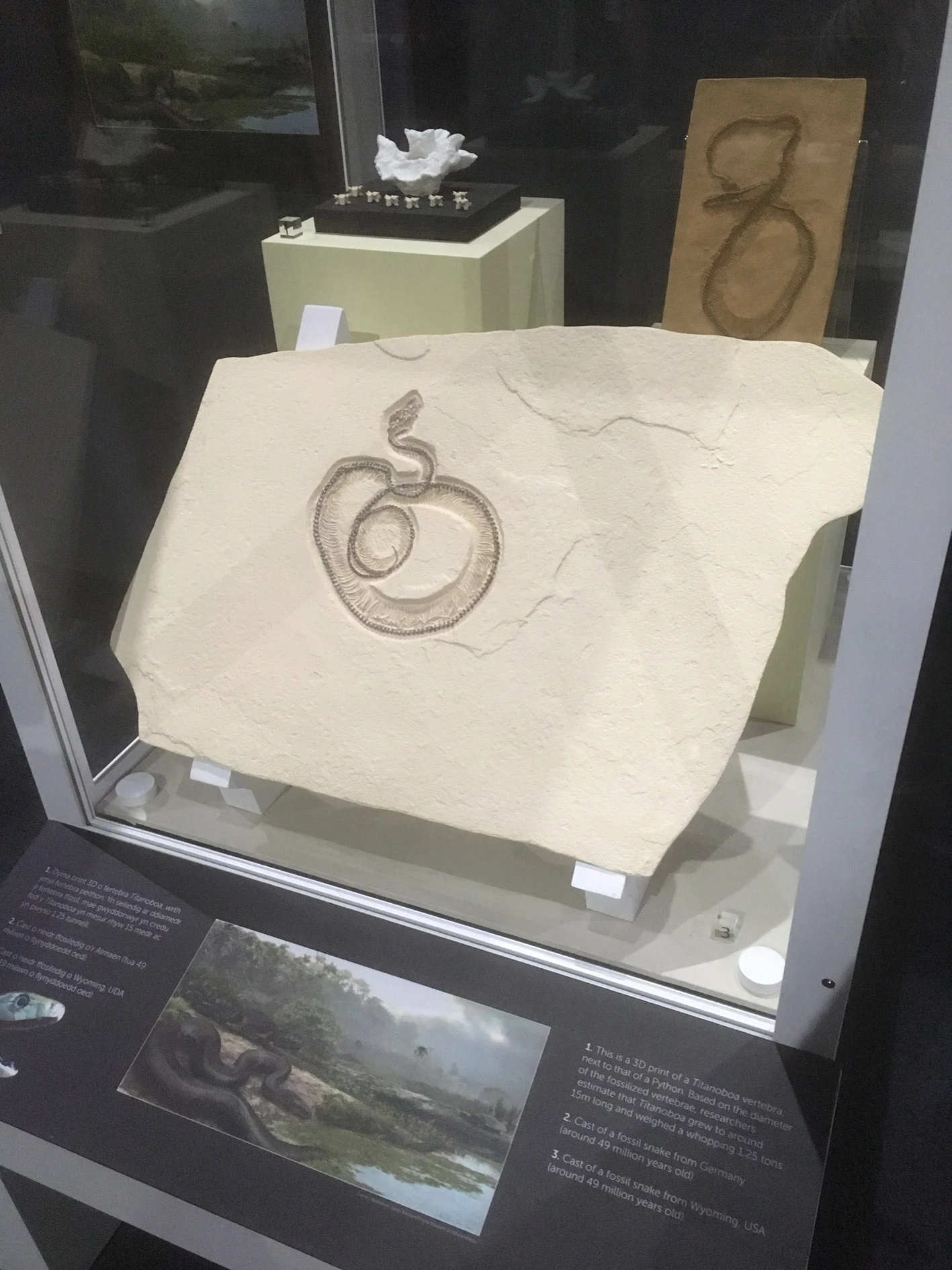 Snake evolution case featuring casts of snake fossils.