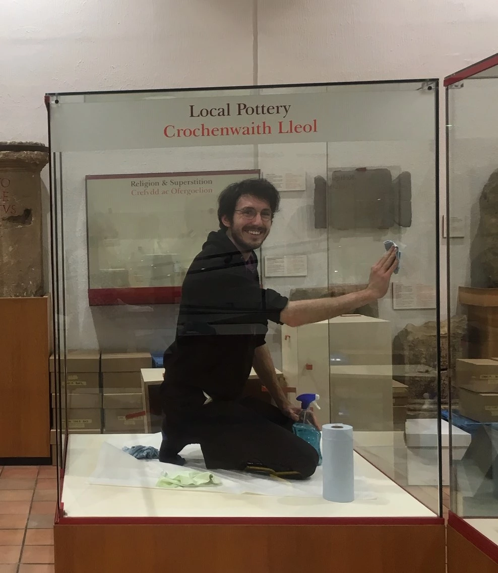 Before the objects were returned, those display cases needed a thoroughly good clean, and there’s only one way to really clean the inside of a case – that is to get inside it!