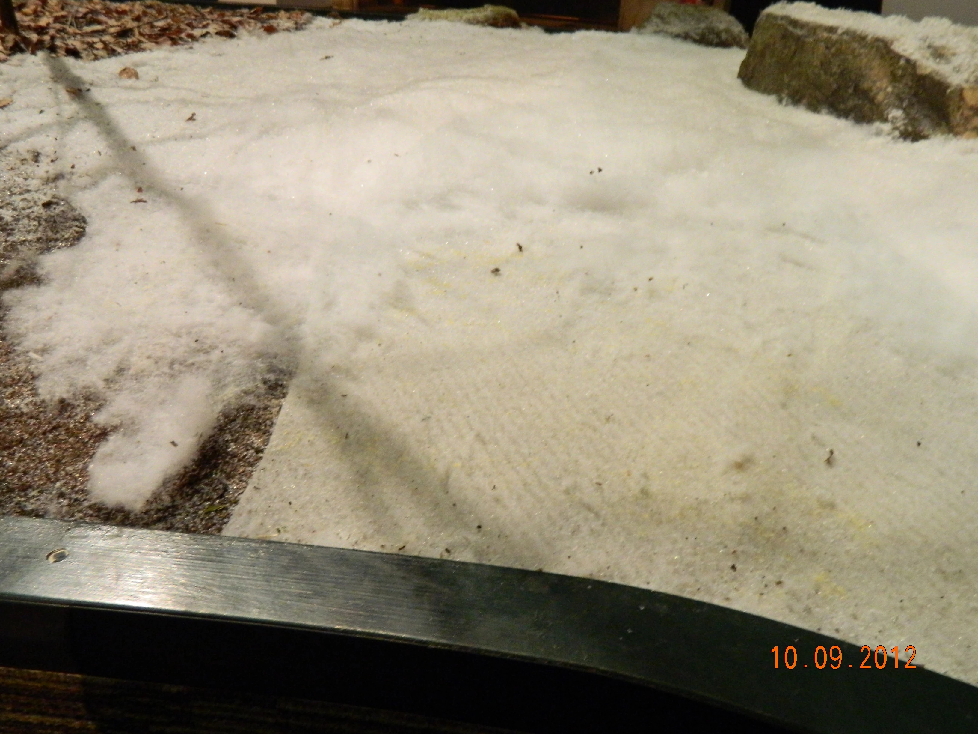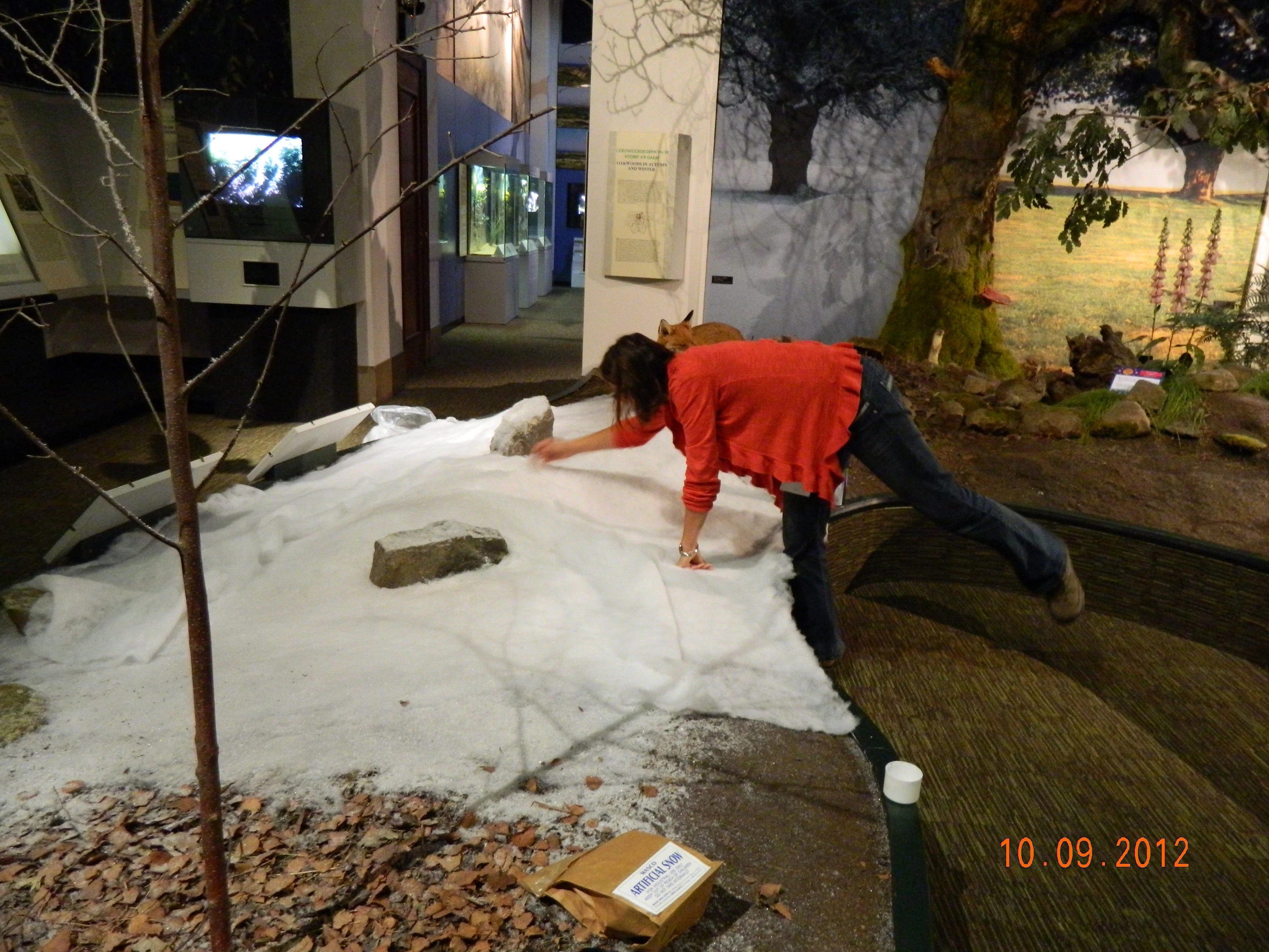 It has to be said that the summer of 2012 was a particularly wet one and the visitor figures shot up as families sought a warm dry haven in our galleries at Cathays Park. The more visitors the better, but the increased footfall presents a challenge for the Natural History Conservation Team as we try to keep up with the wear and tear on the galleries. We know it’s very tempting for the younger visitors to touch the open dioramas and our sparkly snow seems to attract them most of all, but as the summer progressed and the small hands reached out, our scenery started to disappear before our eyes!