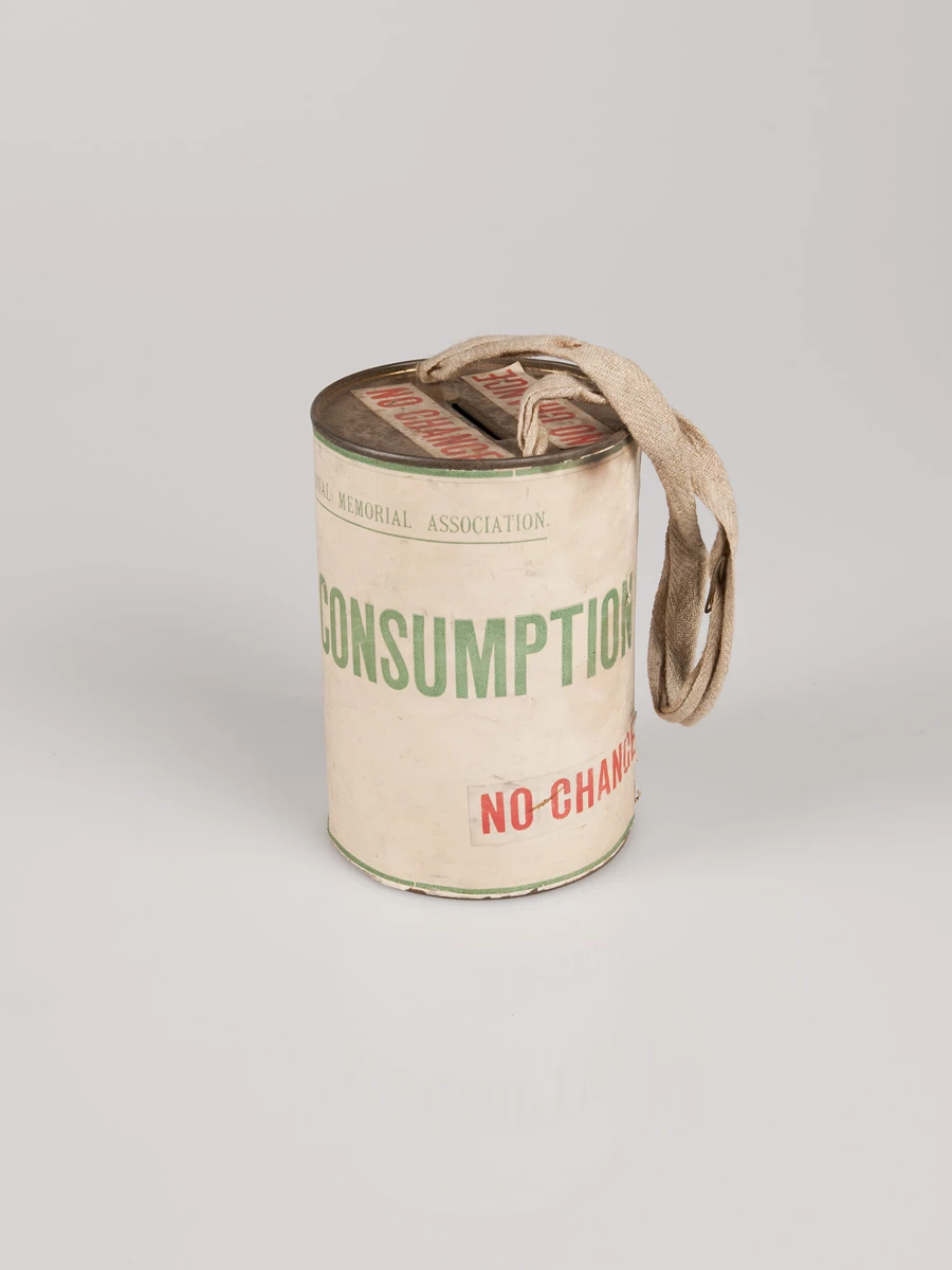 Yma yn Sain Ffagan, mae blwch yn y casgliad a ddefnyddwyd yng Ngorffennaf 1914 i gasglu arian er budd y Gymdeithas. O’i amgylch mae’r adysgrif The King Edward VII Welsh National Memorial Association – Crusade againt Consumption – No Change – 21 July 1914, 22 July 1914, 23 July 1914.